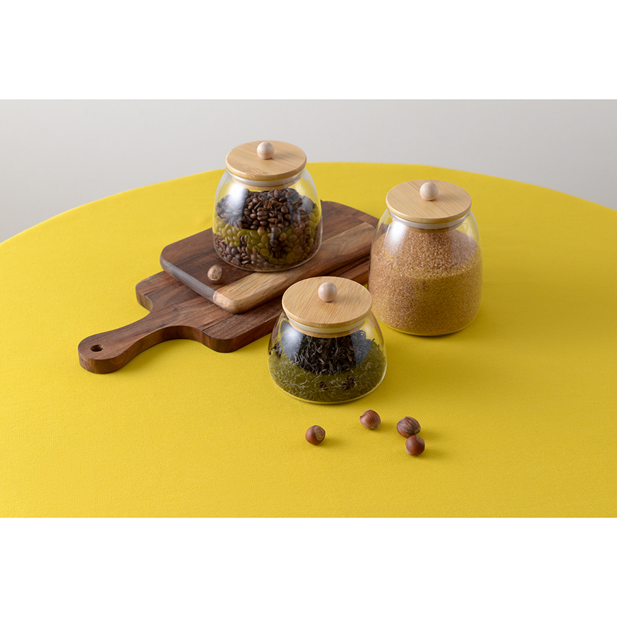 Банка плотно закрывается благодаря силиконовому ободку на бамбуковой крышке. Боросиликатное стекло отличается прочностью.