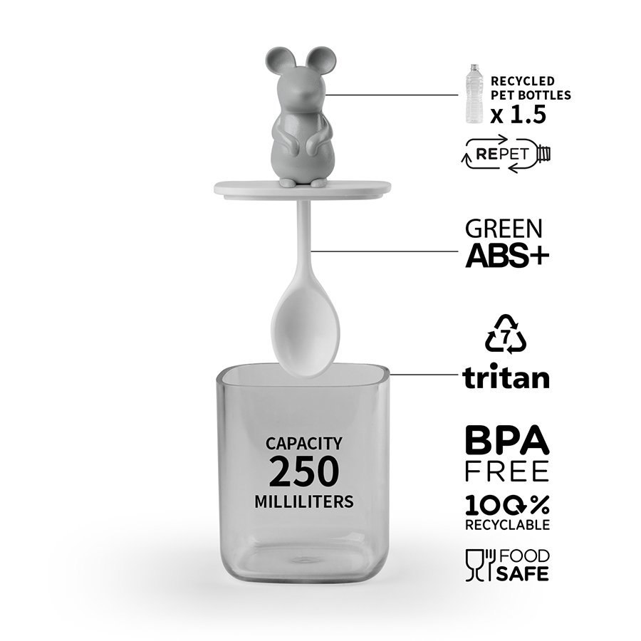 Контейнер выполнен из переработанных пластиковых бутылок. Материал пригоден для вторичной переработки и безопасен для здоровья, поскольку не содержит бисфенол-А. Конструкция предусматривает ложку для удобства использования.