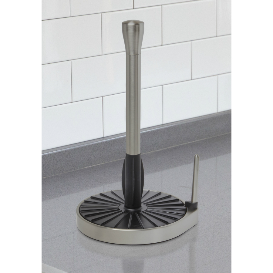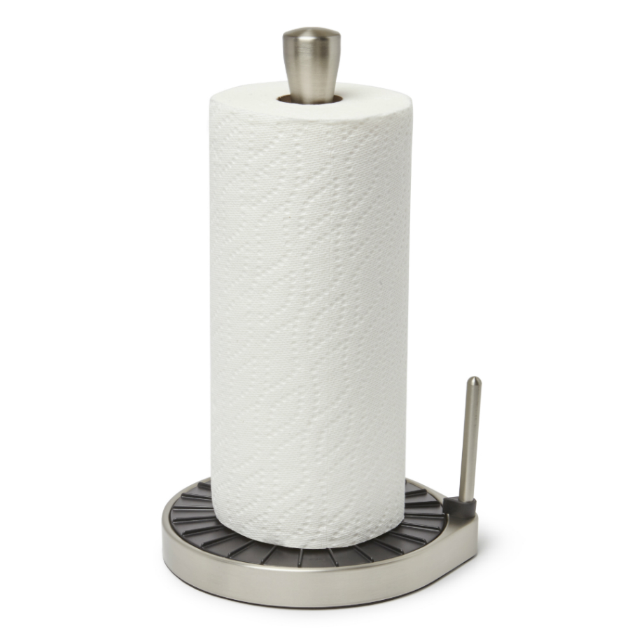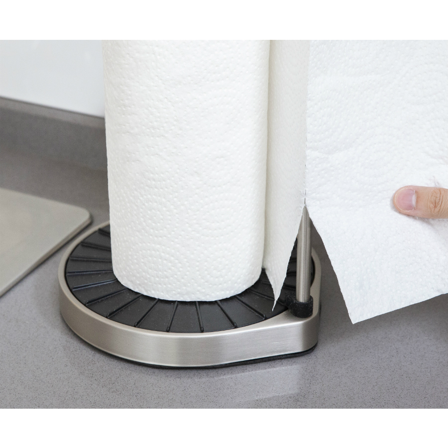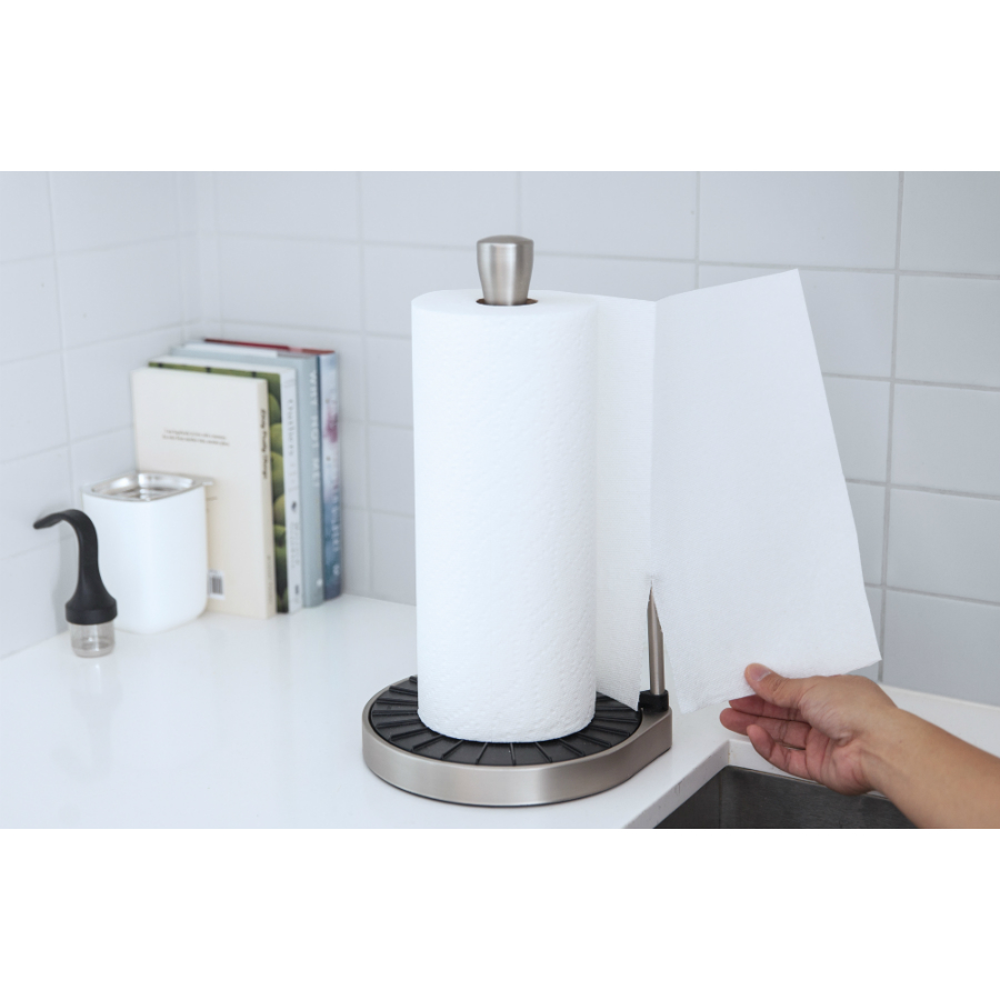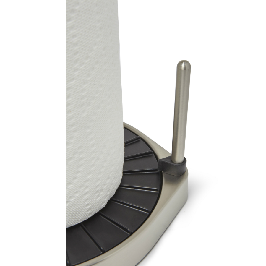 Силиконовый тикер с ребристой поверхностью замедляет вращение рулона, тем самым позволяет легко рвать бумажные полотенца одной рукой. Благодаря утяжеленному никелированному основанию аксессуар защищен от опрокидывания.
