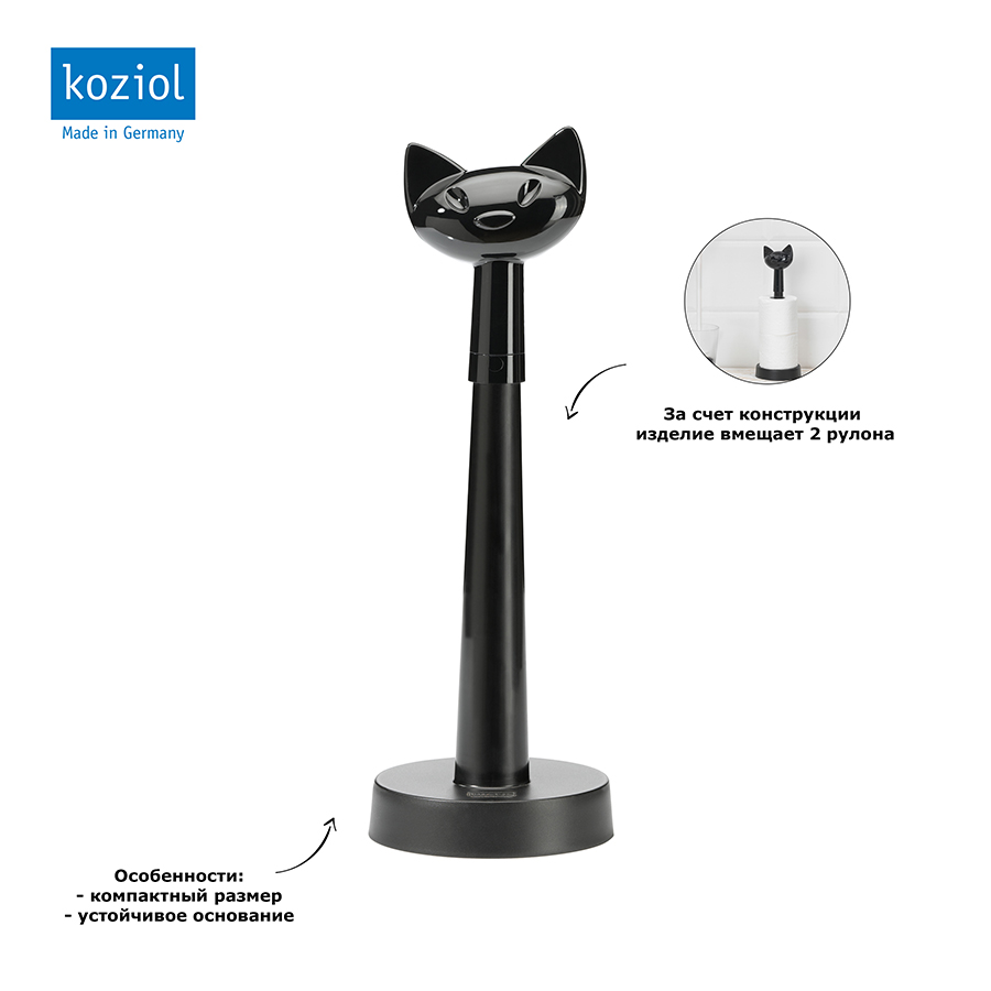 Держатель для туалетной бумаги Miaou – стильный аксессуар для туалетной комнаты. За счет необычной конструкции изделие вмещает два рулона, которые прочно закреплены на основании и не разматываются. Поменять рулоны можно, просто сняв зажимную головку.