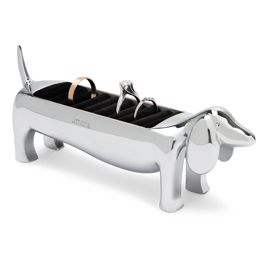 Держатель для украшений Dachsie выполнен в виде таксы. Изделие позволяет хранить любимые кольца и перстни в одном месте. Его можно поставить на комод, прикроватную тумбочку или стол.