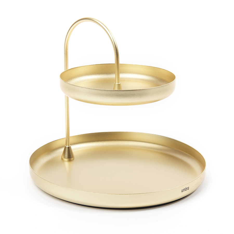 Стильный двухуровневый органайзер для украшений и аксессуаров, который может быть и не спасёт вас от ежедневного хаоса, но поможет его упорядочить. На нижней большой полочке можно хранить крупные предметы: часы, браслеты, ключи, а на маленькой верхней — кольца, серьги, и цепочки. Матовое латунное покрытие достаточно сдержанно, чтобы дополнить даже классические интерьеры, но и вполне элегантное, чтобы стать частью интерьера в современном или минималистичном стиле.