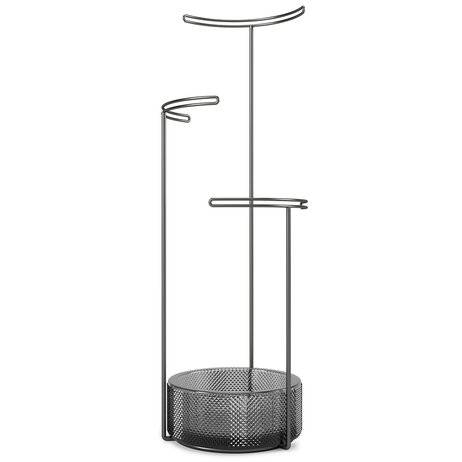 Утяжеленная стеклянная основа служит дополнительным отсеком для хранения, а прочные металлические стойки разной высоты подходят для украшений любой длины.