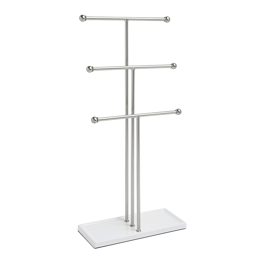 Высокотехнологично и высокофункционально: трехярусный держатель для украшений продуман для мелочей. Самый высокий - для бус, средний - для длинных серег и цепочек, малый - для браслетов, сережек, колец. Плюс подставка держателя как дополнительное пространство для часов или клипс. Если ваши украшения хранятся в коробке или еще хуже - валяются в ящике стола, то самое время организовать их!