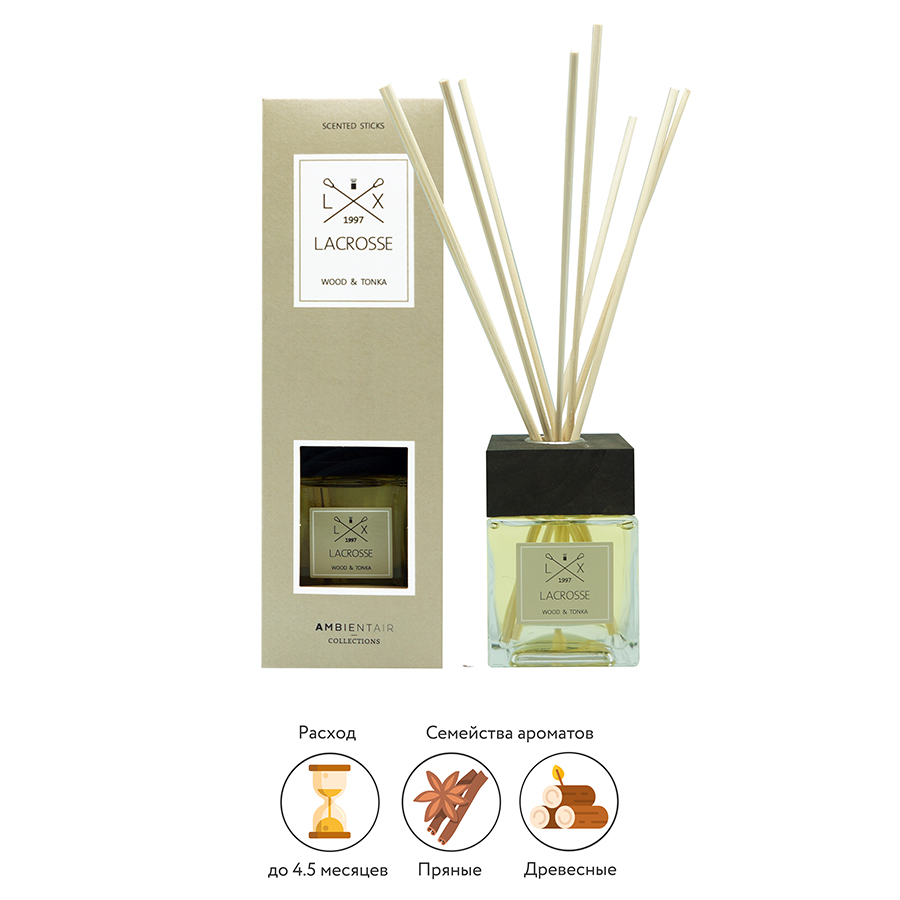 Выразительный и насыщенный аромат, в котором древесные ноты смягчены бобами тонка. Изысканная парфюмерная композиция подойдет для элегантных интерьеров и подарит ощущение умиротворения и расслабления.