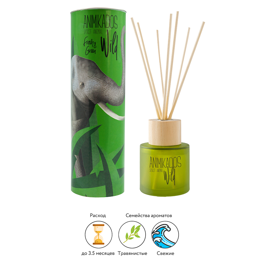 Ароматический диффузор Elephant из коллекции Wild наполняет пространство легкими нотками сочной и свежей зелени. В комплект входят палочки из ротанга и флакон с парфюмерной композицией, которая изготовлена на основе натуральных эфирных масел.