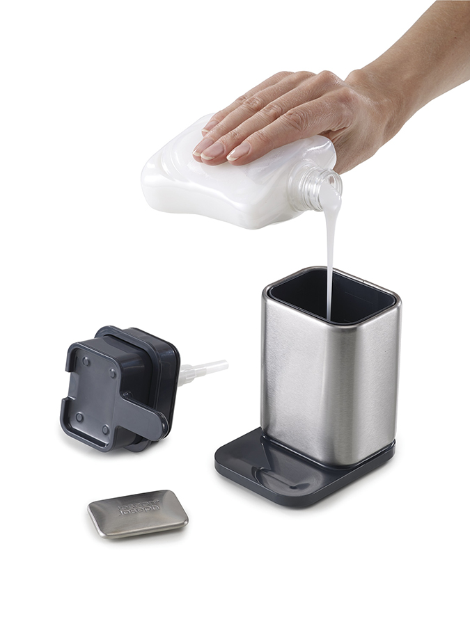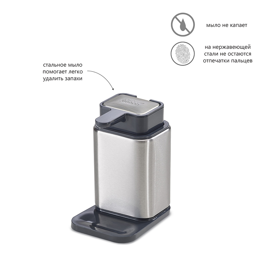 Стальное мыло помещается , ,в верхнюю часть емкости и не требует дополнительного места возле раковины. В нескользящей основе диспенсера предусмотрен выступ для капель из носика. Все предметы коллекции изготовлены из пластика с отделкой из стали класса SS430, хорошо известной своими антикоррозийными свойствами.