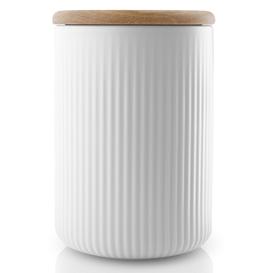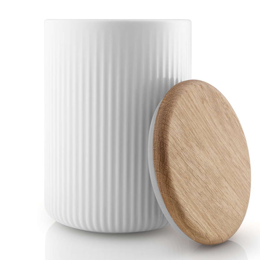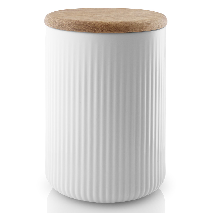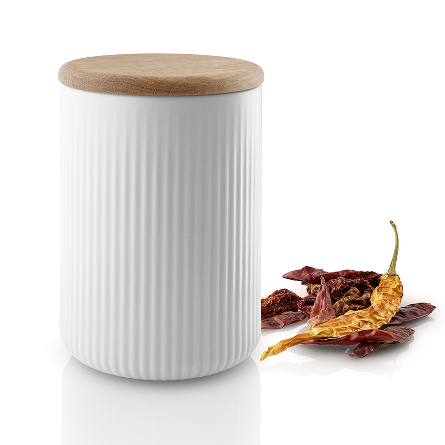 Аксессуар выполнен из высококачественного фарфора белого цвета. Банка снабжена дубовой крышкой с силиконовым уплотнителем. Благодаря этому продукты сохранят вкус и будут защищены от влаги.