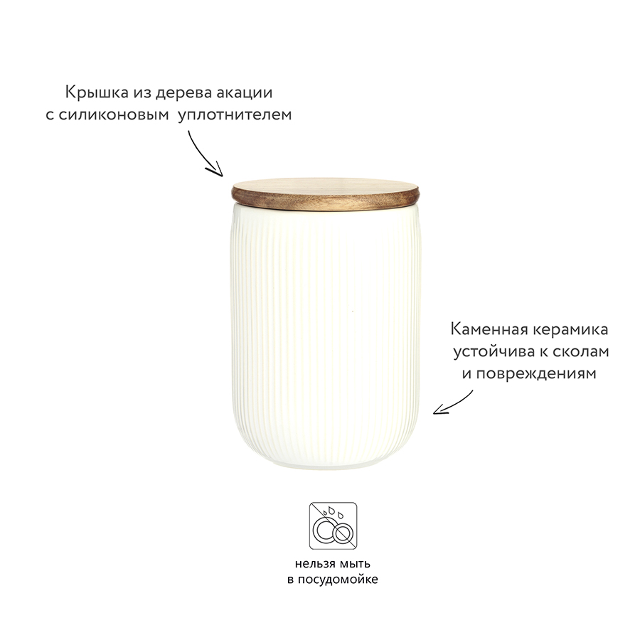 Изделие выполнено из качественной каменной керамики, устойчивой к сколам и повреждениям. Крышка из дерева акации дополнена силиконовым уплотнителем, который защитит от влажности и сохранит качество содержимого.