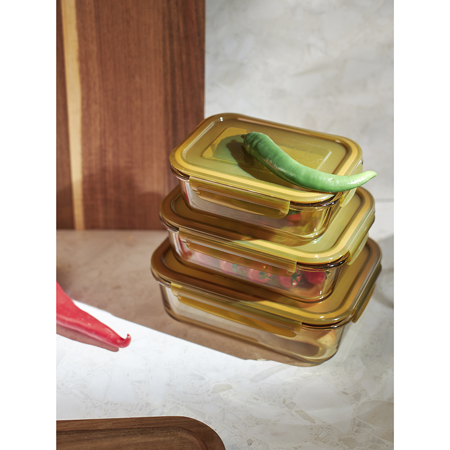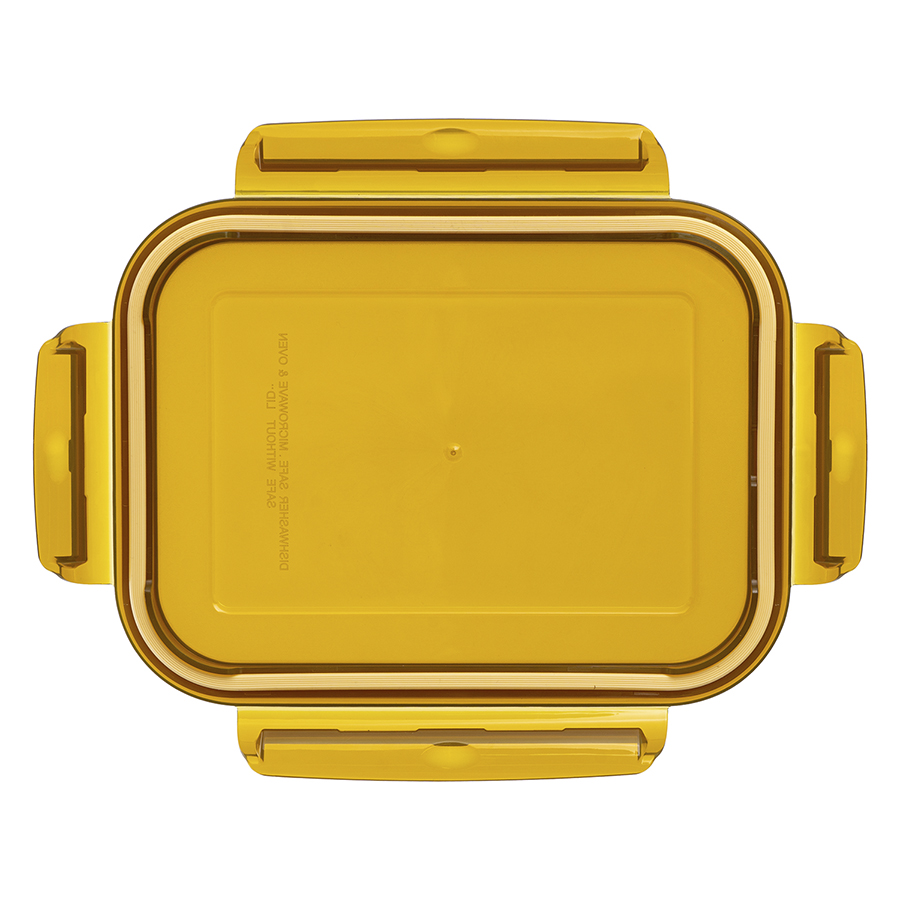 Емкость выполнена из боросиликатного стекла. Материал обладает повышенной стойкостью к механическим повреждениям, температурным перепадам, безвреден для здоровья и окружающей среды, за счет чего идеально подходит для контакта с пищей. Пластиковая крышка плотно прилегает благодаря специальным защелкам, расположенным с четырех сторон.