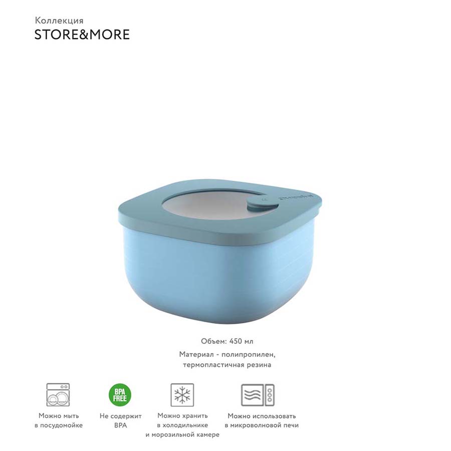 Пищевой контейнер Store&More объемом 450 мл идеально подходит для использования дома и на открытом воздухе. Посуда предназначена для хранения продуктов в холодильнике или морозильной камере, нагрева в микроволновой печи, транспортировки и подачи блюд. Изделие можно взять с собой на дачу, пикник или на работу. Идея создания пищевого контейнера в форме куба с плавными обтекаемыми углами принадлежит дизайнерской студии Spalvieri & Del Ciotto.