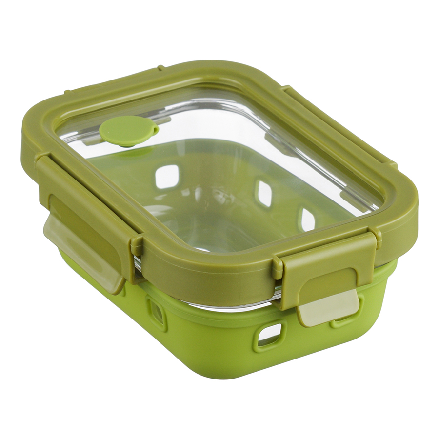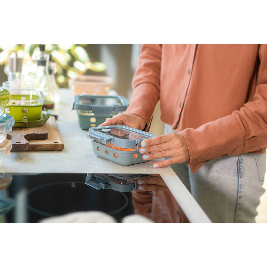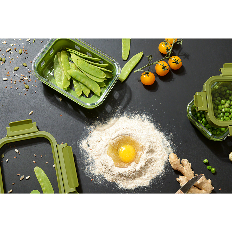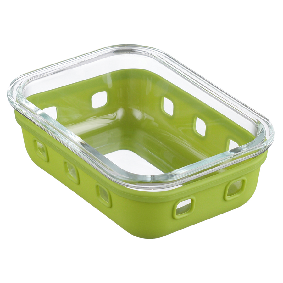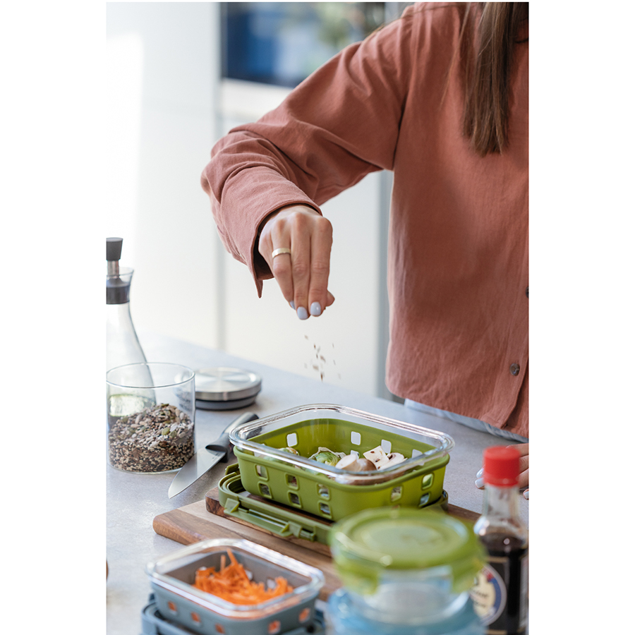 Контейнер в чехле отлично подходит для хранения, запекания и транспортировки продуктов, в том числе готовых блюд. Емкость из боросиликатного стекла закрывается крышкой с надежными замками на каждой стороне. Материал не содержит бисфенола-А и является абсолютно безопасным для здоровья. Наличие специального вентиляционного отверстия позволяет выпустить из контейнера лишний воздух или горячий пар, что повышает герметичность и улучшает условия хранения продуктов.