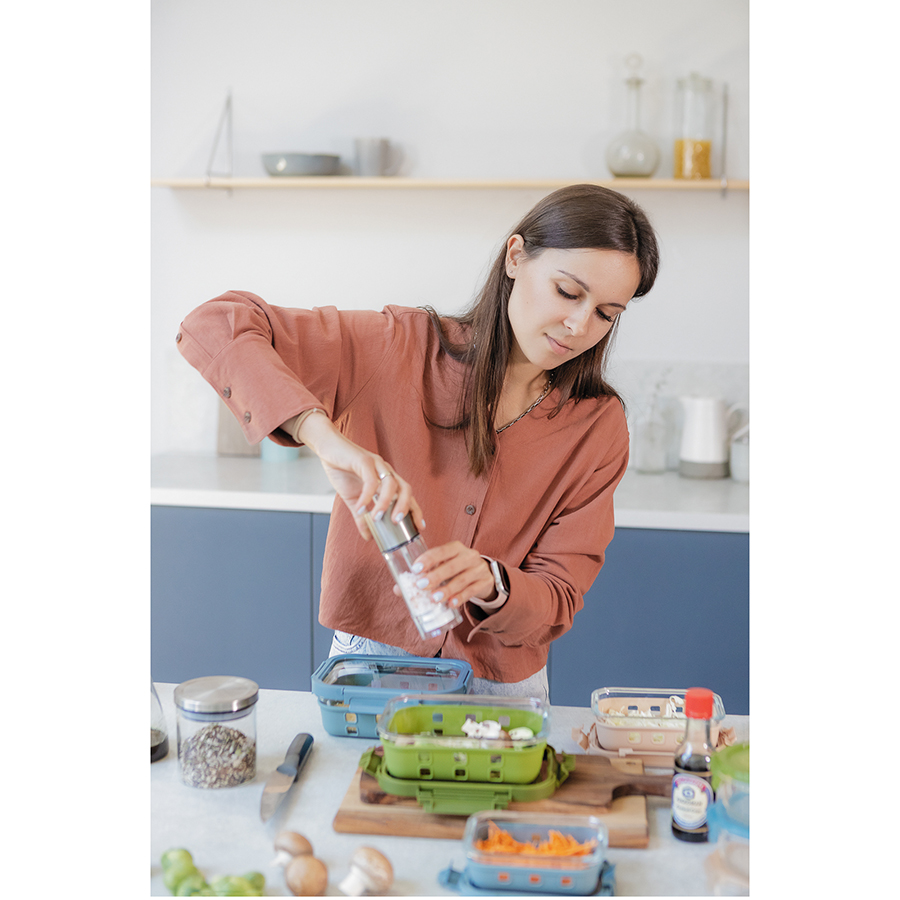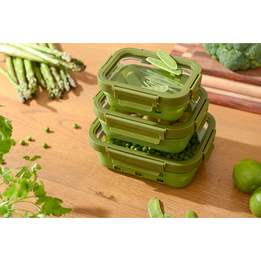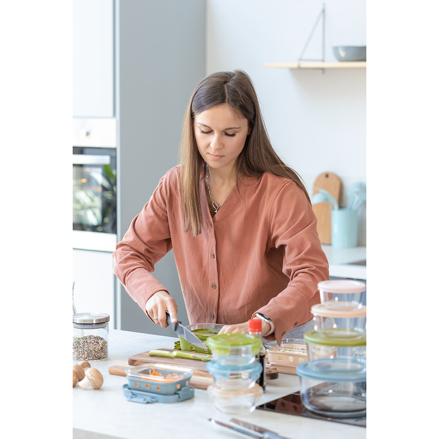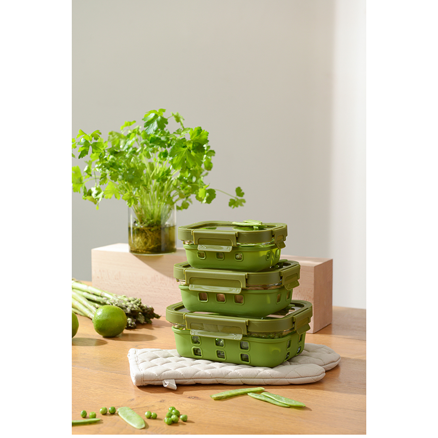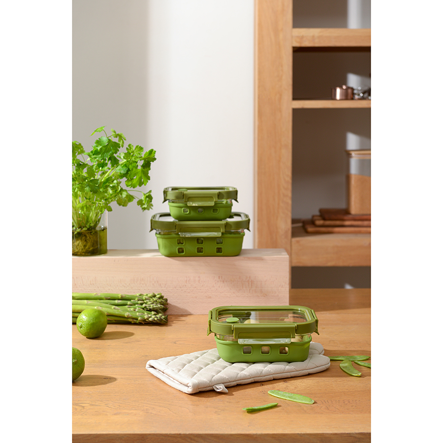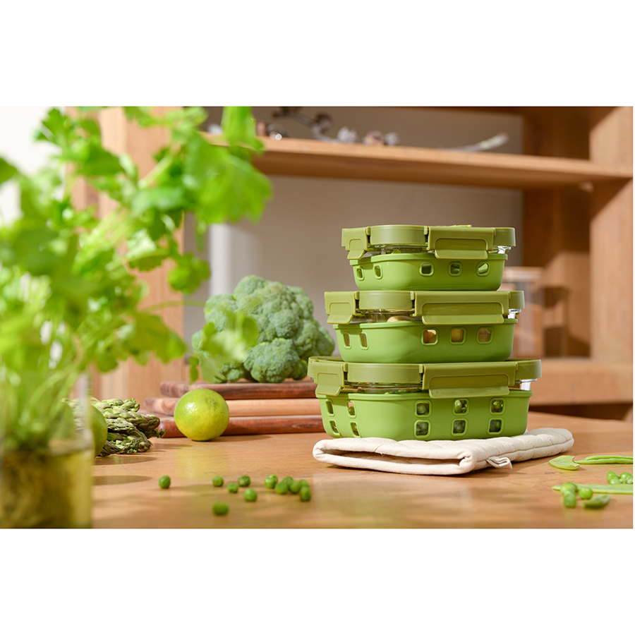Контейнер в чехле отлично подходит для хранения, запекания и транспортировки продуктов, в том числе готовых блюд. Емкость из боросиликатного стекла закрывается крышкой с надежными замками на каждой стороне. Материал не содержит бисфенола-А и является абсолютно безопасным для здоровья. Наличие специального вентиляционного отверстия позволяет выпустить из контейнера лишний воздух или горячий пар, что повышает герметичность и улучшает условия хранения продуктов.