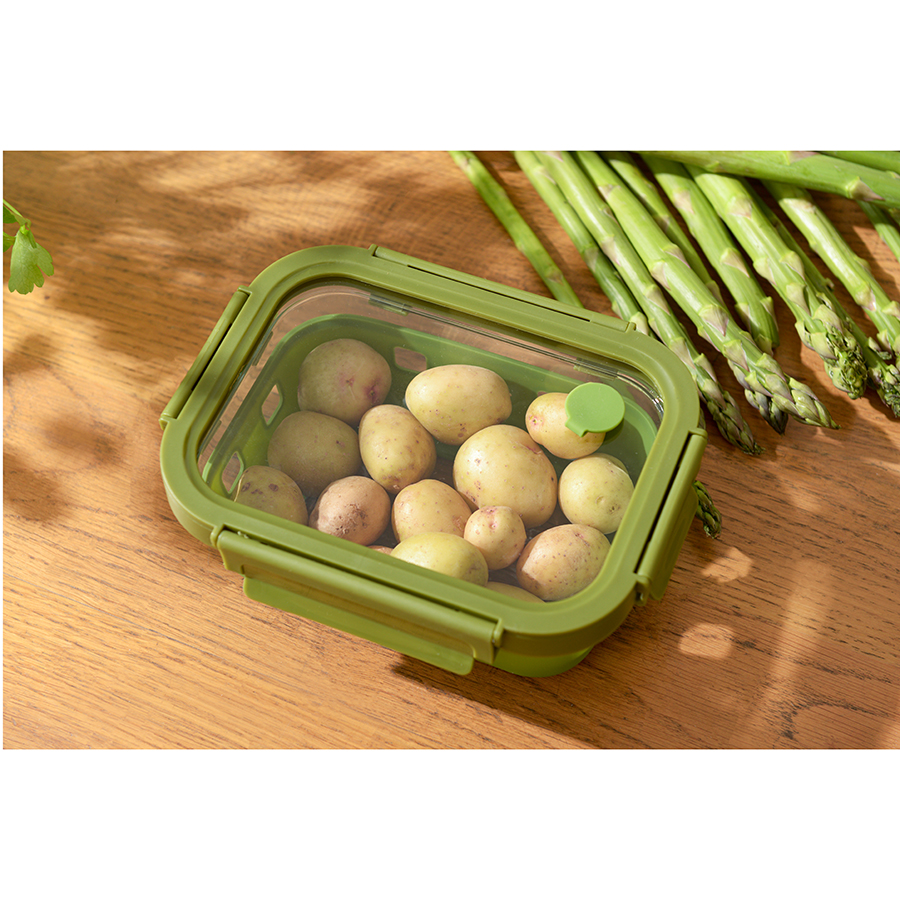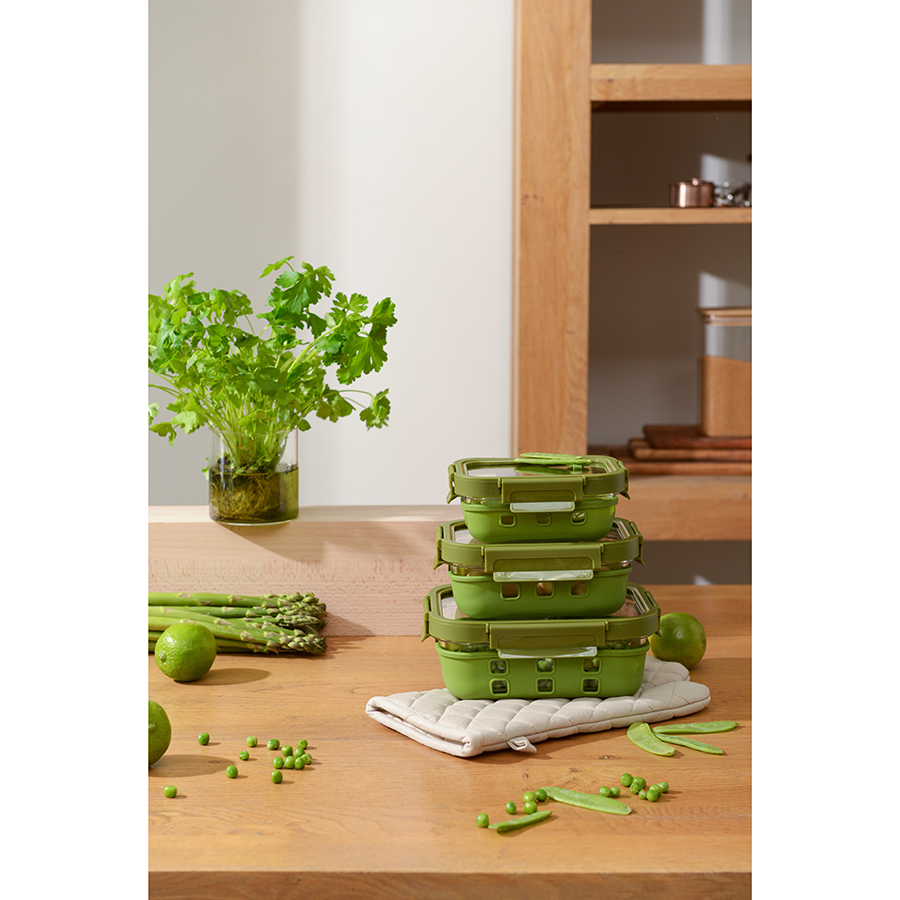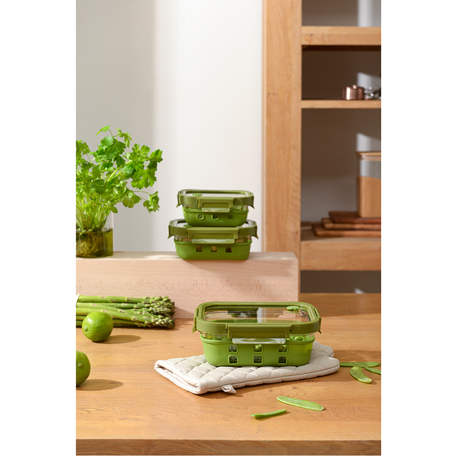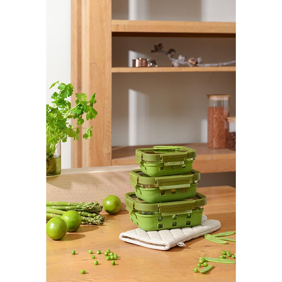 Контейнер в чехле отлично подходит для хранения, запекания и транспортировки продуктов, в том числе готовых блюд. Емкость из боросиликатного стекла закрывается крышкой с надежными замками на каждой стороне. Материал не содержит бисфенола-А и является абсолютно безопасным для здоровья. Наличие специального вентиляционного отверстия позволяет выпустить из контейнера лишний воздух или горячий пар, что повышает герметичность и улучшает условия хранения продуктов.