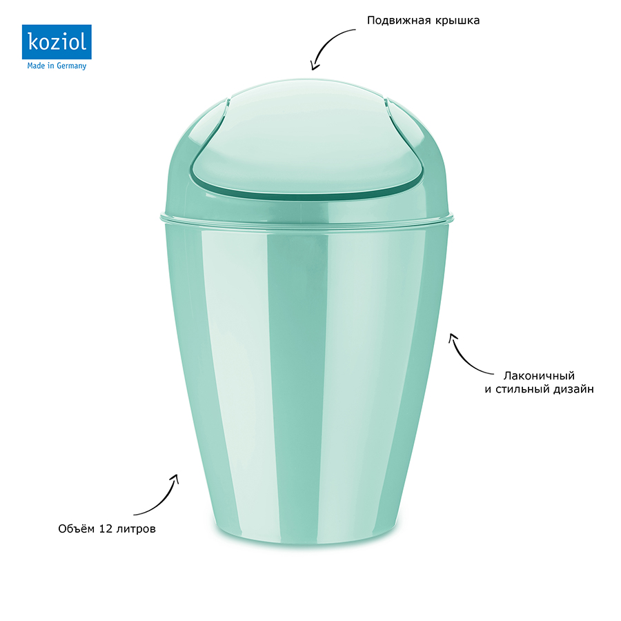 Вместительная корзина для мусора Del поможет навести порядок на кухне и в ванной. Емкость из переработанного полипропилена приятного мятного оттенка отличается лаконичным дизайном и устойчивостью к износу. Практичный материал обеспечивает изделию долговечность, легко очищается от всевозможных загрязнений. Модель с поворотной крышкой удобная в использовании.