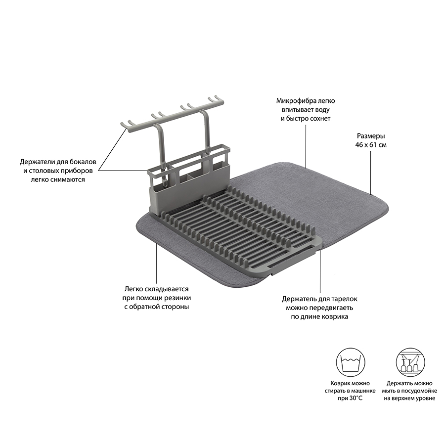 Коврик удобен для сушки чашек, стаканов и глубоких мисок, а подставка — для тарелок и блюдец. Легко разбирается для удобной чистки. Для хранения компактно складывается и закрепляется с помощью эластичных завязок. Размеры в разложенном виде: 46х27,3х61 см.