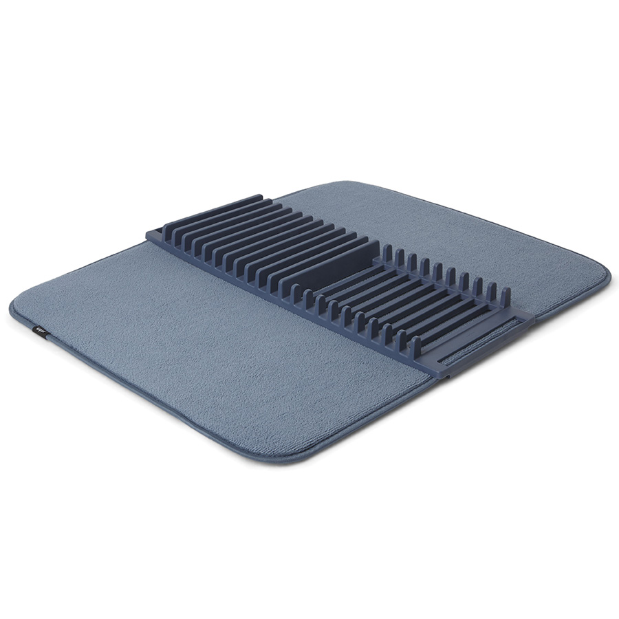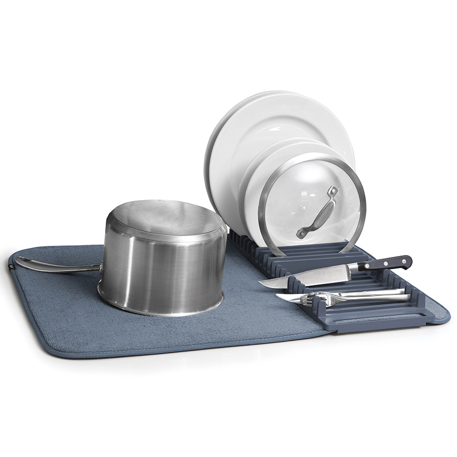 Коврик из микрофибры удобен для сушки чашек, стаканов и глубоких мисок, а подставка — для тарелок и блюдец. Аксессуар можно легко разобрать для чистки и компактно сложить для хранения, закрепив с помощью эластичных ремешков. Размеры: 61х46 см.