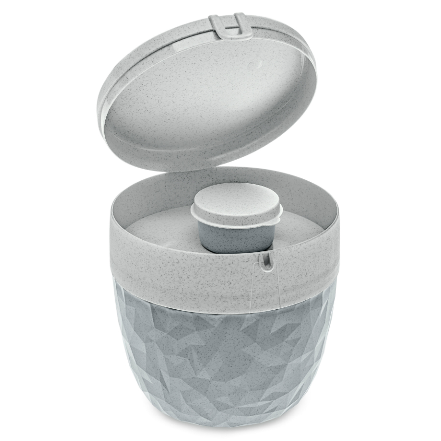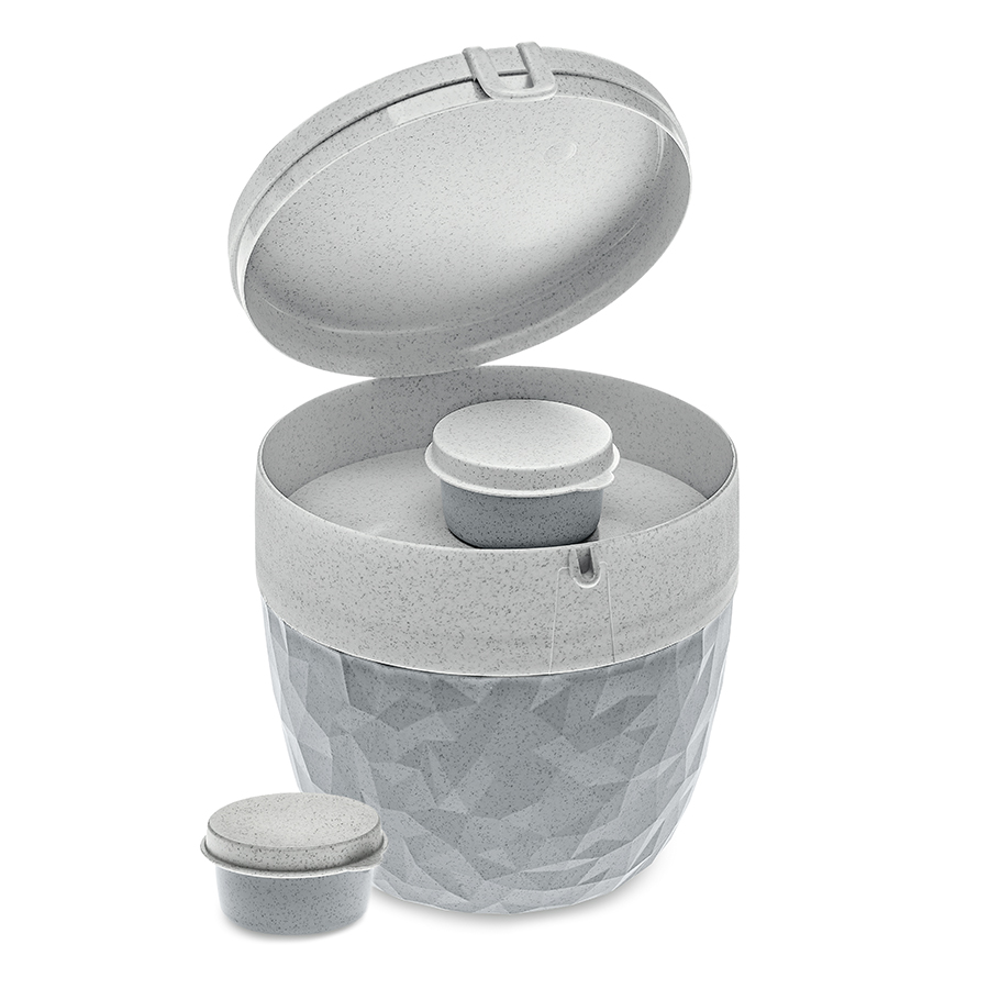Ланч-бокс Club Bento Organic – практичный контейнер для вкусного завтрака и перекуса. Изделие представлено в стильном дизайне – наружная поверхность оформлена фактурным рисунком в виде неправильных острых граней. Ланч-бокс можно взять с собой на работу, прогулку или поездку. Особенность контейнера в том, что все ингредиенты аккуратно отделены друг от друга, а смешать вы сможете их непосредственно перед употреблением. В верхней части контейнера можно хранить начинку: ягоды, нарезанные фрукты или овощи, гренки или орехи. В комплект также входит небольшая соусница для заправки, сиропа или меда.