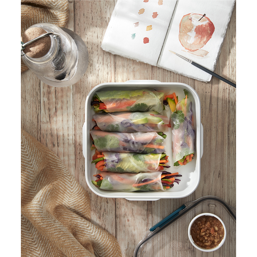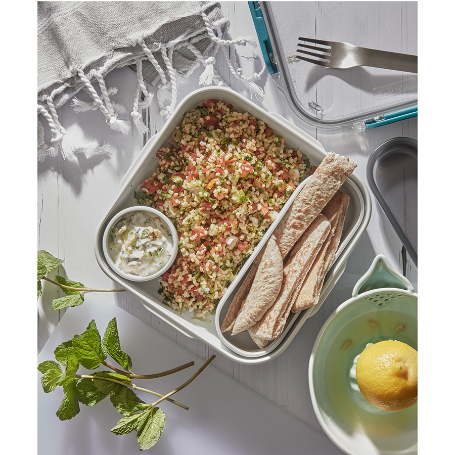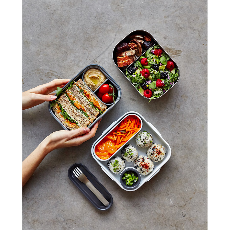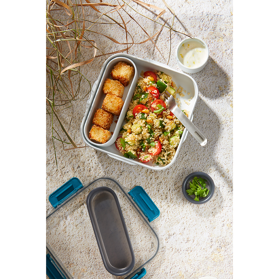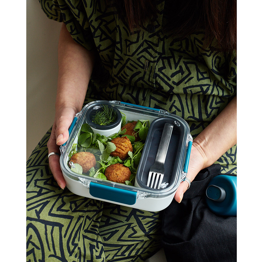 Стильный ланч-бокс Original из полипропилена с нержавеющей вилкой, дополнительным контейнером и соусником в комплекте. Аксессуар объемом 1 л не занимает много места в сумке и позволяет вместить завтрак или полноценный обед: мясо, рыбу, гарнир, салат и соус. Верхняя крышка из прозрачного пластика Tritan герметично закрывает ланч-бокс и легко открывается при помощи защелок. Соусник и внутренний контейнер снабжены плотно прилегающими силиконовыми крышками. Ланч-бокс можно хранить в холодильнике и мыть в посудомоечной машине. При разогреве пищи в микроволновой печи верхнюю крышку следует снять.