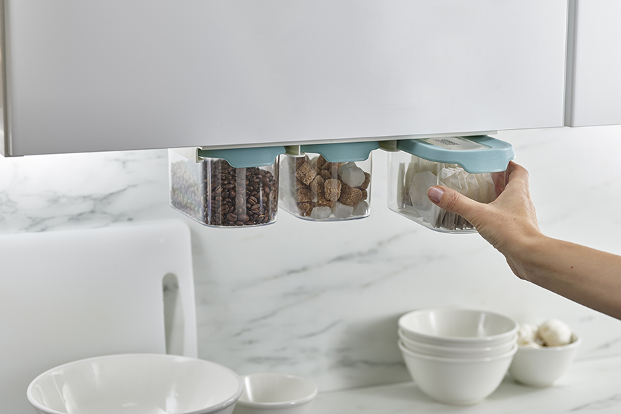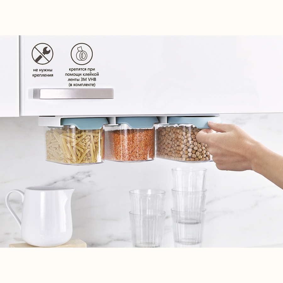 Подвесное крепление емкостей позволит освободить драгоценное место на полках в кухонных шкафчиках. Контейнеры выполнены из прозрачного пластика, благодаря чему открывается отличная видимость и доступ к хранящимся продуктам. Герметичные крышки снабжены удобными язычками для открывания емкостей.