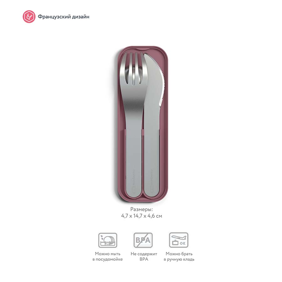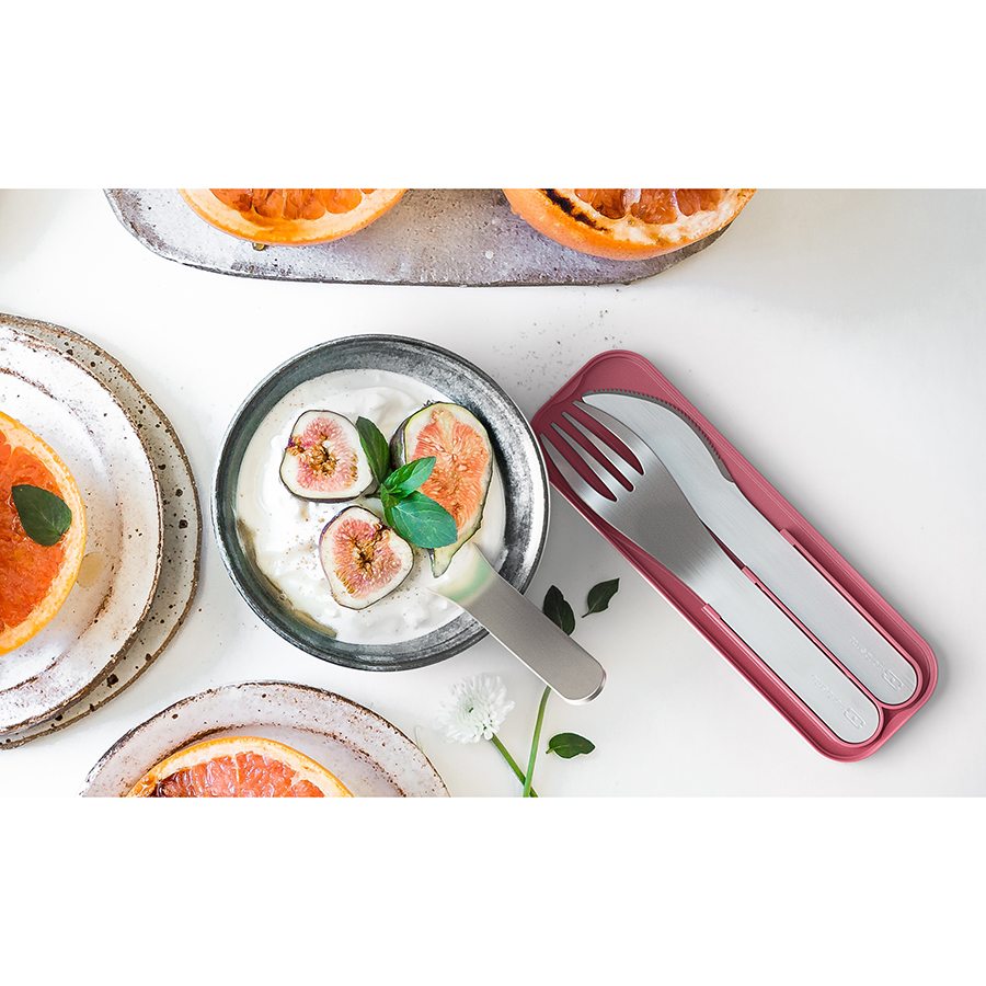 Миниатюрные и компактные приборы в специальном футляре идеально подходят по размеру и крепятся к крышке ланч-бокса Monbento под резинку. В наборе все основные столовые предметы – ложка, вилка и нож. Теперь перекусывать и обедать в любом месте еще удобнее.