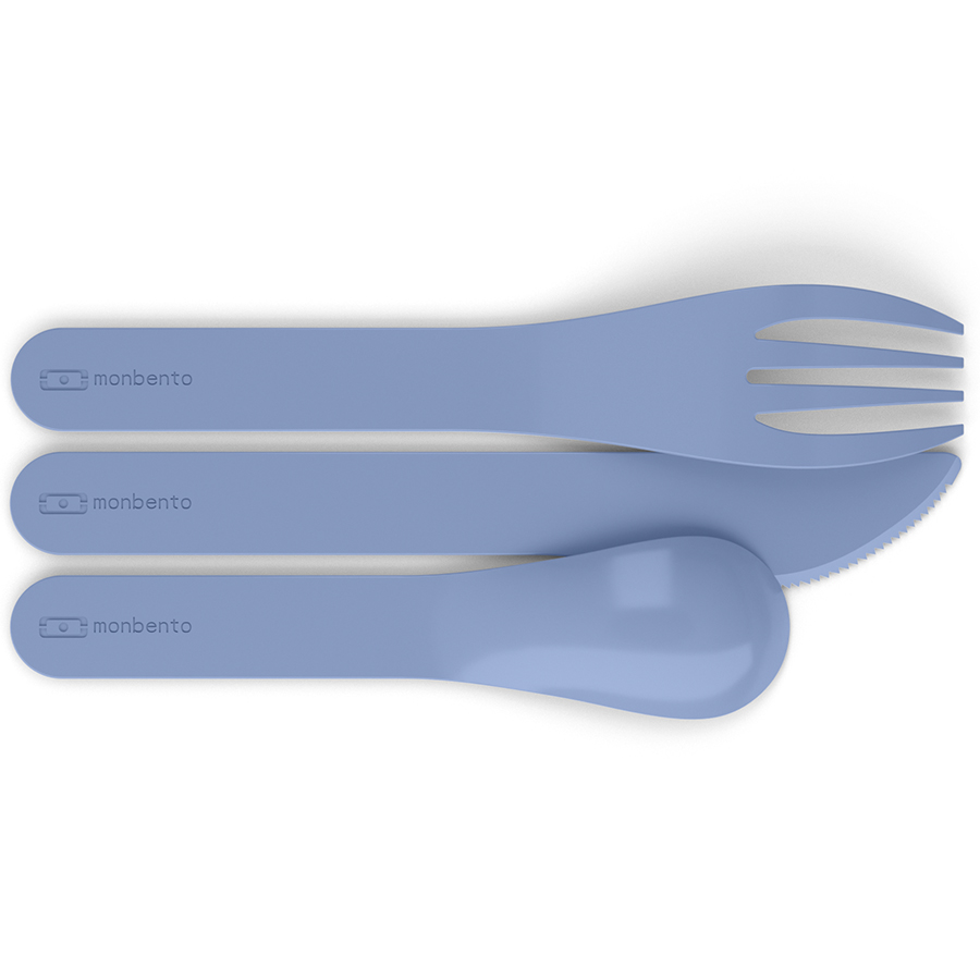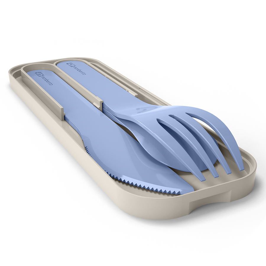 Компактные приборы хранятся в специальном футляре. Набор удобно хранить под крышкой ланч-бокса Monbento. Приборы изготовлены из PLA - 100%, биоразлагаемого пластика, произведенного из растений. При этом они очень прочные. Приборы изготовлены без примеси вредного для здоровья бисфенола-а.