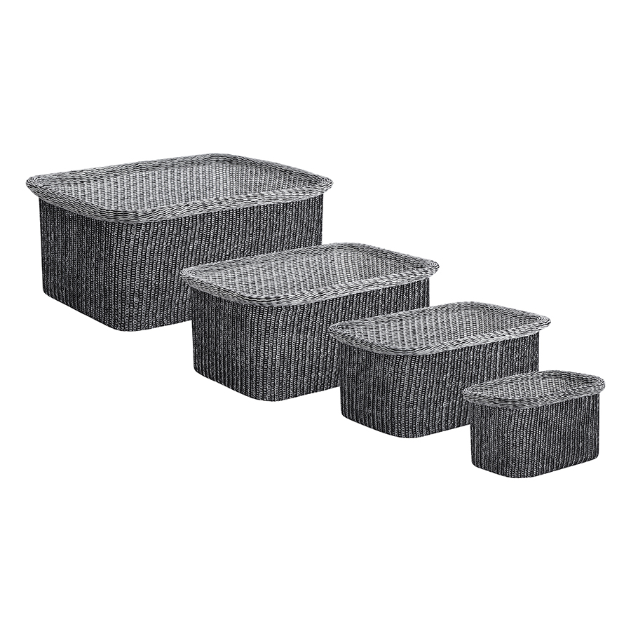 Материалы: полиэстер, хлопок, железо. Размеры корзин: 30х42х19,5 см, 27х37х18,5 см, 22х32х17 см, 17х22,5х13,5 см. Цвет: черный. Количество в наборе: 4 шт. Максимальная нагрузка: 17 кг, 13 кг, 8 кг, 3,5 кг.
