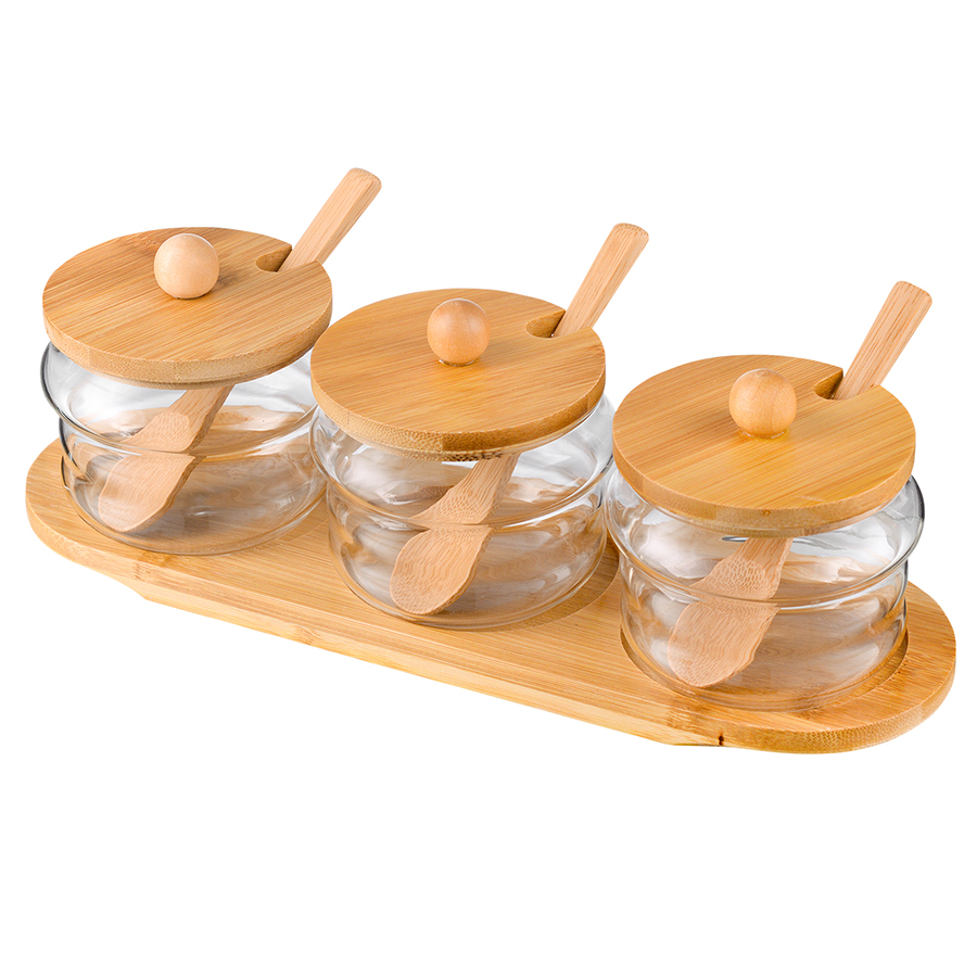 Банки из стекла с деревянной крышкой и ложкой великолепно дополнят коллекцию стильной посуды. Емкости идеально подходят для хранения специй. Благодаря компактности занимают минимум места на полке и в шкафу. Удачное сочетание материалов и лаконичный дизайн делают набор отличным приобретением и оригинальным презентом к празднику.