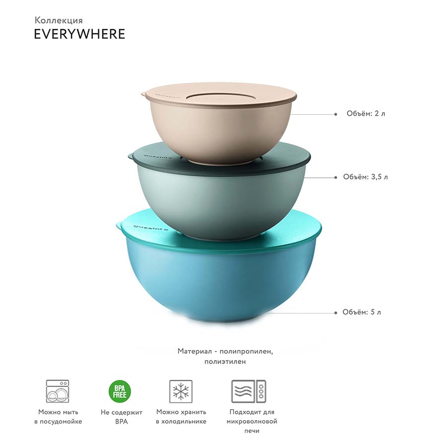Набор из 3-х контейнеров для хранения продуктов Everywhere — незаменимые помощники на кухне: их можно хранить в холодильнике, использовать в микроволновой печи (,предварительно сняв крышку),, они не бьются и безопасны для природы и человека, поскольку сделаны из перерабатываемых и сертифицированных материалов. Их легко мыть благодаря гладкой и полированной внутренней поверхности, а также удобно открывать и закрывать за счет мягкой крышки.