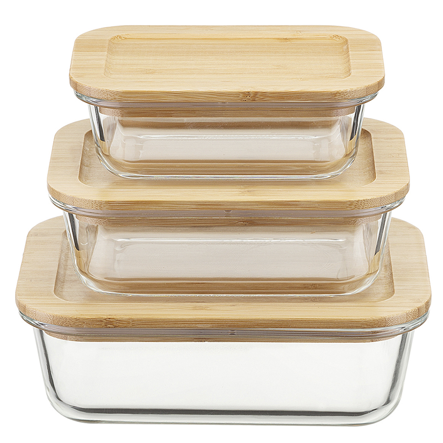 Материалы: боросиликатное стекло, бамбук, силикон. Размеры: маленький – 10,5х15,5х5,5 см, средний – 12,6х17,2х6 см, большой – 15х20х6,8 см. Объем: 370 мл, 640 мл,1,05 л. Количество предметов в наборе: 3 шт.