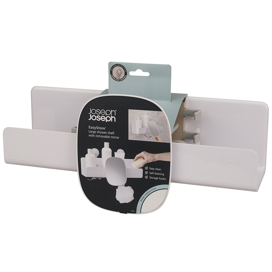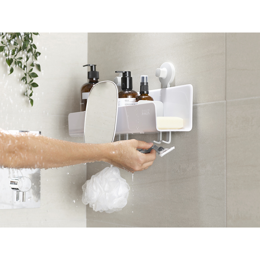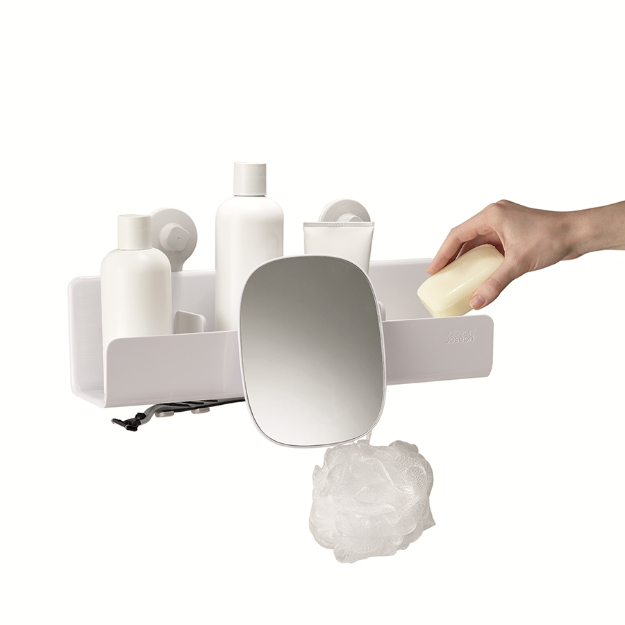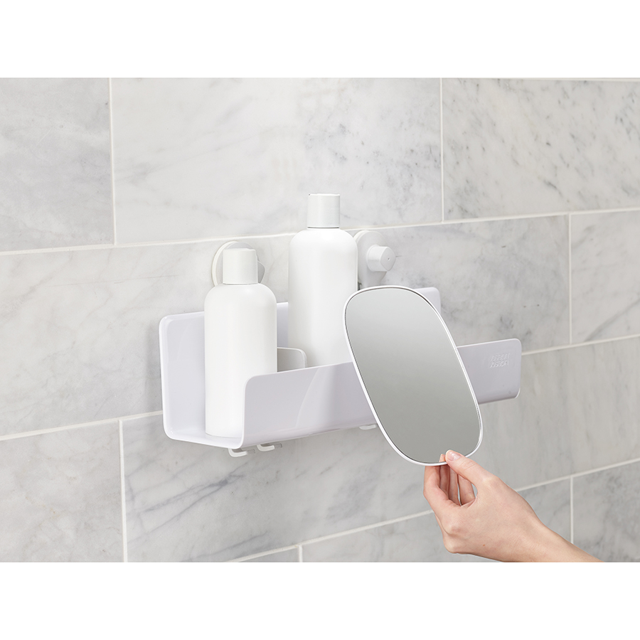 Органайзер с простой дренажной конструкцией легко установить без интрументов, так как он держится на присосках. Выдерживает до 3,5 кг веса. Полочка достаточно большая, чтобы вместить ваши бутылки и тюбики. Она оснащена крючками для станков и губок, а также съемным небьющимся зеркалом. Размеры 22 x 26.5 x 18 см.