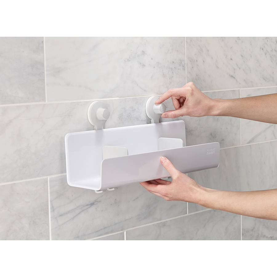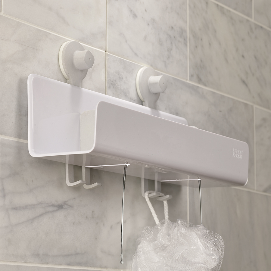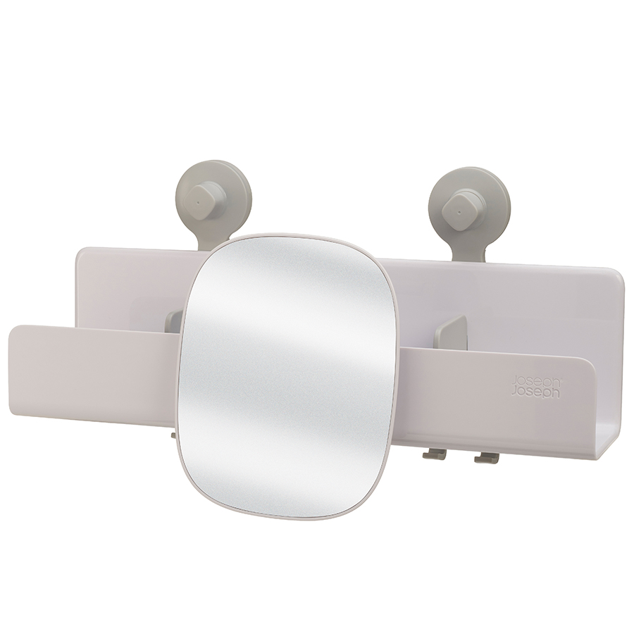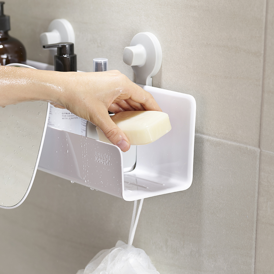 Органайзер с простой дренажной конструкцией легко установить без интрументов, так как он держится на присосках. Выдерживает до 3,5 кг веса. Полочка достаточно большая, чтобы вместить ваши бутылки и тюбики. Она оснащена крючками для станков и губок, а также съемным небьющимся зеркалом. Размеры 22 x 26.5 x 18 см.
