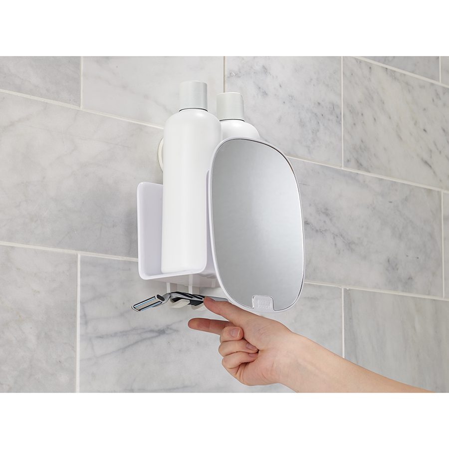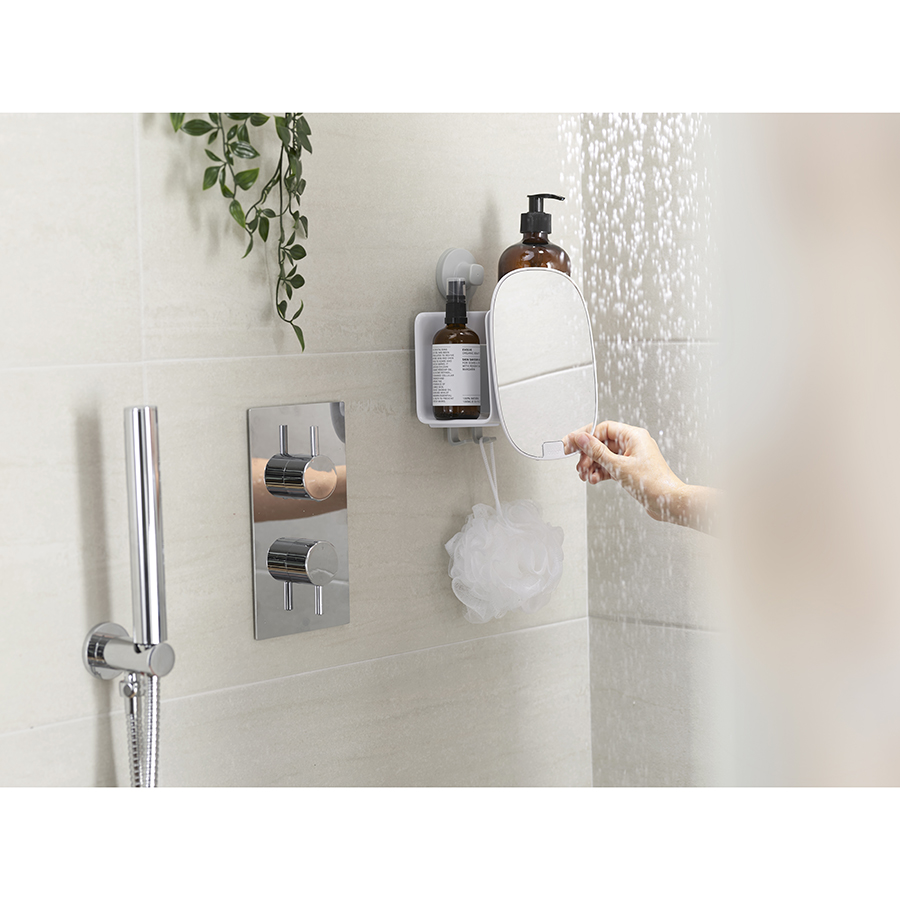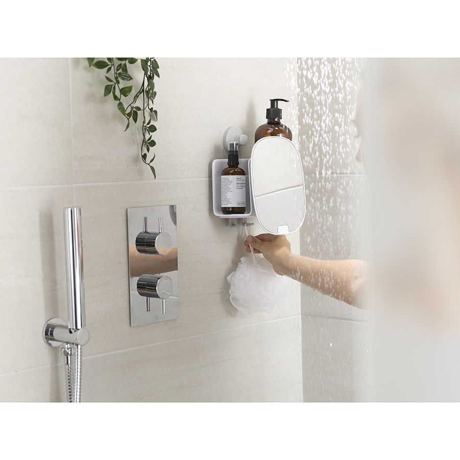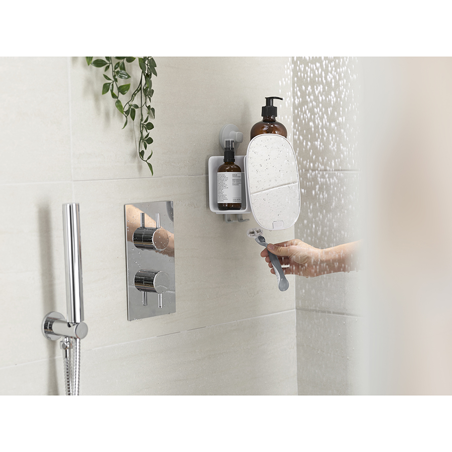 Органайзер с простой дренажной конструкцией легко установить без интрументов, так как он держится на присосках. Выдерживает до 2 кг веса. Полочка достаточно большая, чтобы вместить ваши бутылки и тюбики. Она оснащена крючками для станков и губок, а также небьющимся зеркалом. Размеры: 22 x 40 x 13 см.