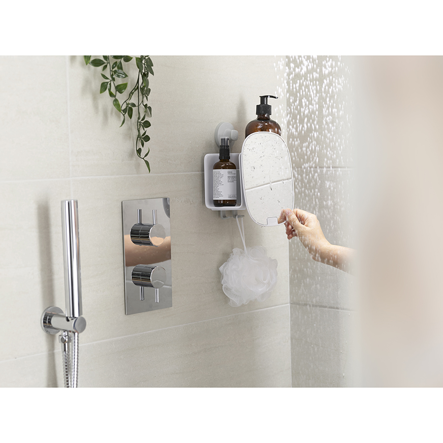 Эта компактная полочка для душа с зеркалом поможет навести порядок в ванной.