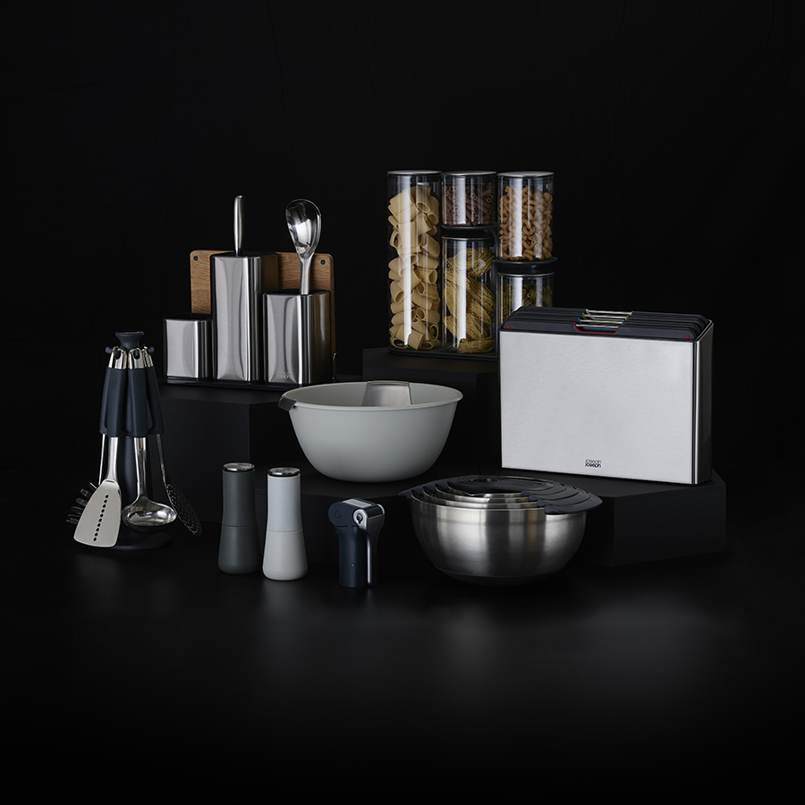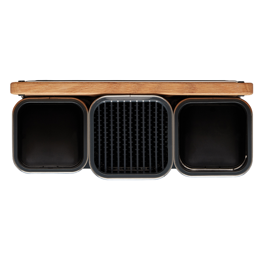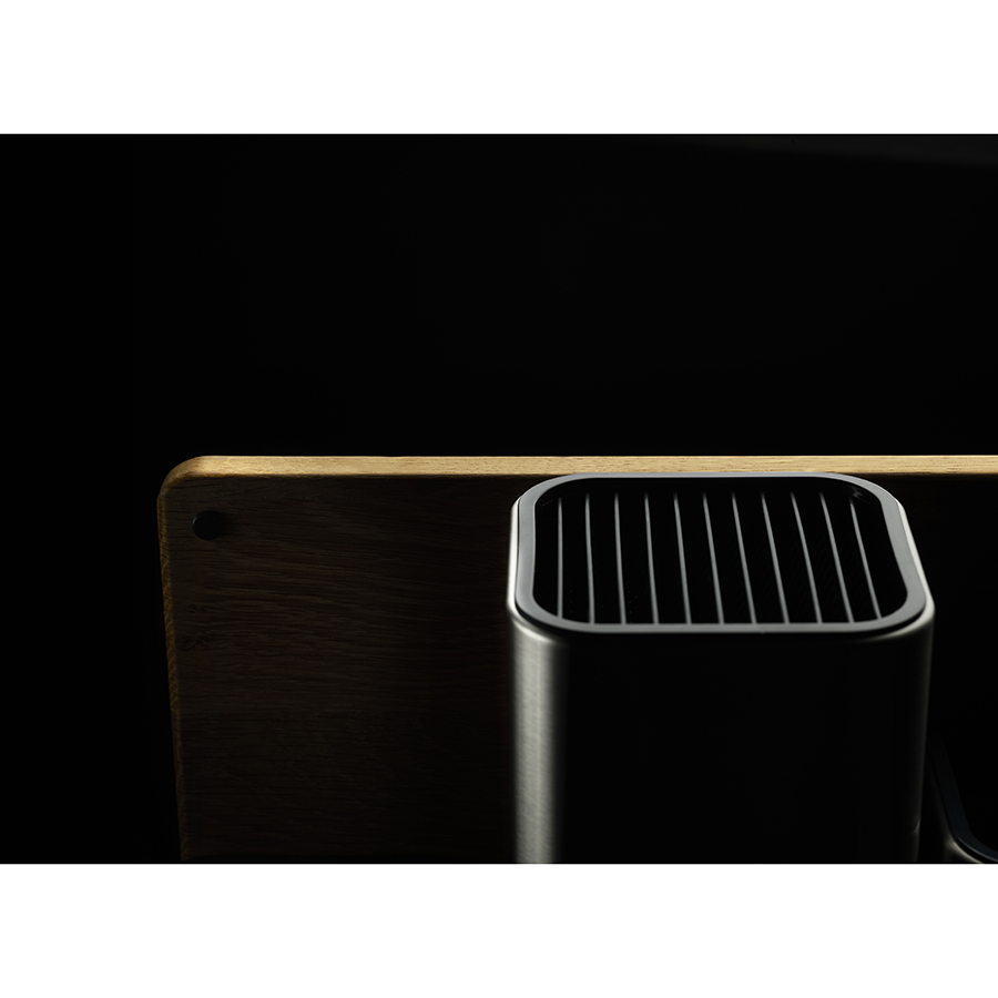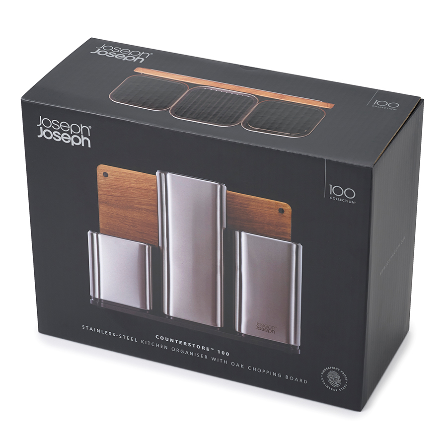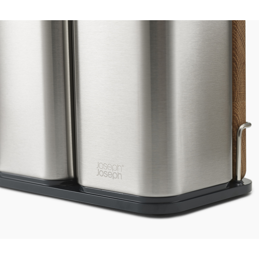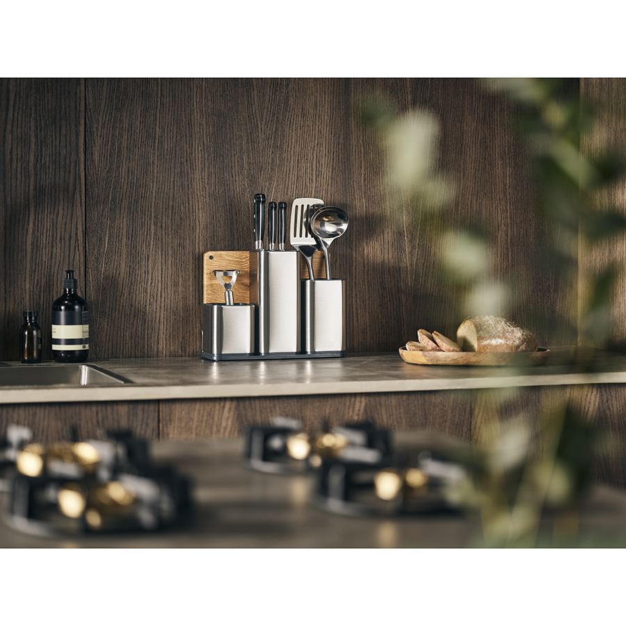 В комплект входят подставка для ножей, органайзер для кухонных инструментов и дубовая доска на нескользящих ножках, для которой предусмотрен держатель с тыльной стороны органайзера. Отсек для ножей подходит для лезвий до 20 см. Все части съемные – стальные контейнеры можно снять с основания и освободить от верхних пластиковых вставок.