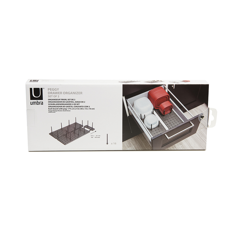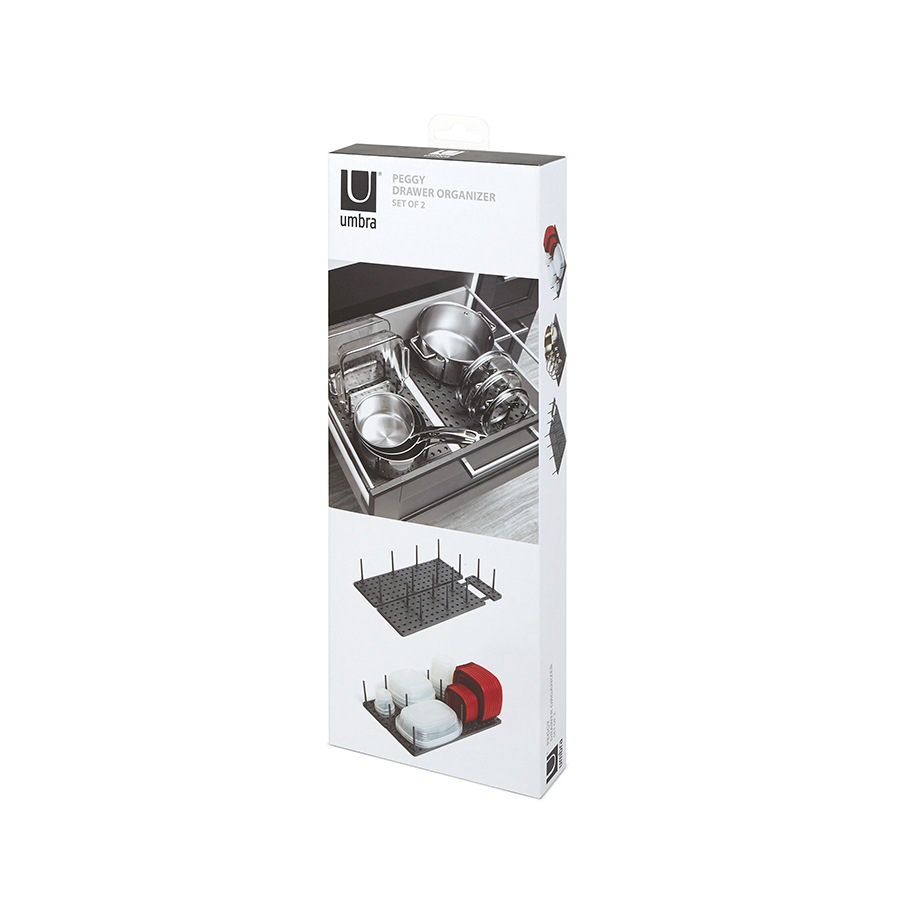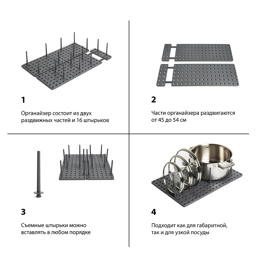Подложка с отверстиями для штырьков позволяет конфигурировать органайзер так, чтобы он был удобен именно вам. Для особенно крупных предметов предусмотрена часть с раздвигающимся основанием. Просто подгоните его под размер вашей посуды и закрепите. Подходит для всех стандартных кухонных ящиков. Комплект включает 2 подложки и 32 штырька. Раздвигается до 54.3 см.