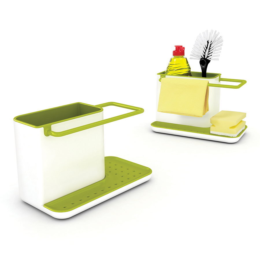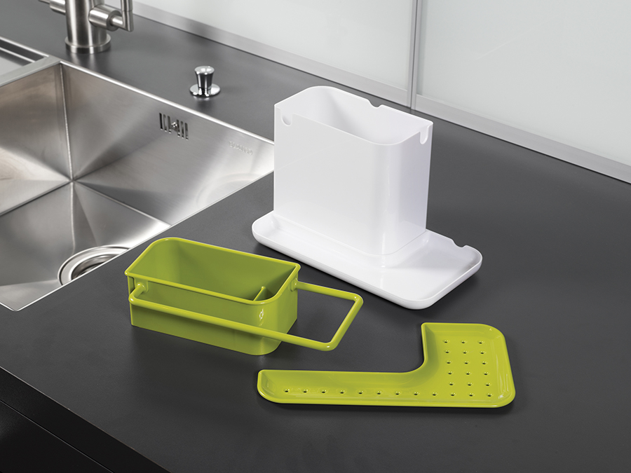 Вместительная основная емкость органайзера предназначена для хранения щеток и бутылок со средствами для мытья. На вешалке, расположенной вдоль ее внешнего края, удобно сушить небольшие тряпки. Широкий поддон с отверстиями предоставляет место для просушивания губок, а скрывающийся под ним резервуар аккуратно собирает стекающую воду. Органайзер легко собирается и разбирается для чистки.