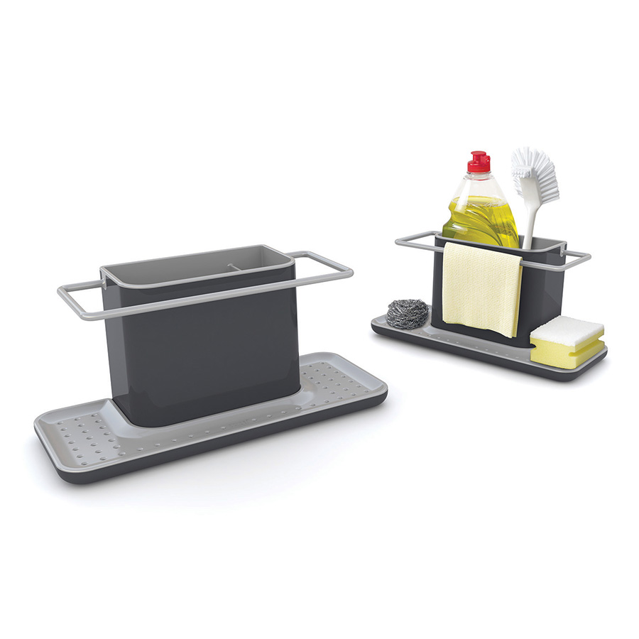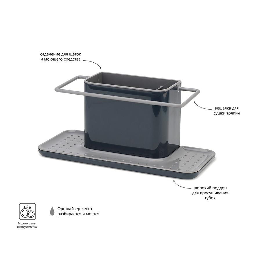 Вместительная основная ёмкость предназначена для хранения щеток и бутылок со средствами для мытья. На вешалке, расположенной вдоль ее внешнего края, удобно сушить небольшие тряпки. Широкий поддон с отверстиями предоставляет место для просушивания губок, а скрывающийся под ним резервуар аккуратно собирает стекающую воду. Органайзер легко собирается и разбирается для чистки.