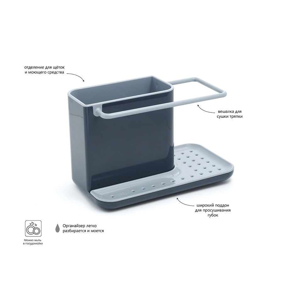 Вместительная основная емкость органайзера предназначена для хранения щеток и бутылок со средствами для мытья. На вешалке, расположенной вдоль ее внешнего края, удобно сушить небольшие тряпки. Широкий поддон с отверстиями предоставляет место для просушивания губок, а скрывающийся под ним резервуар аккуратно собирает стекающую воду. Органайзер легко собирается и разбирается для чистки.