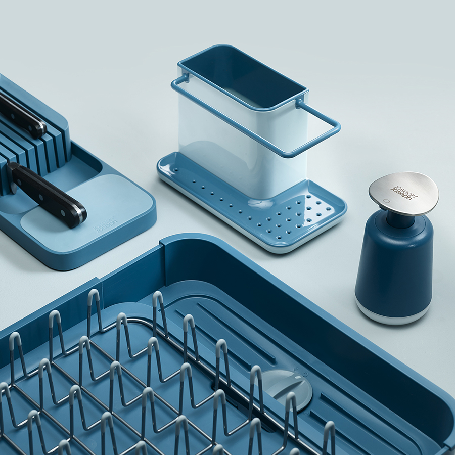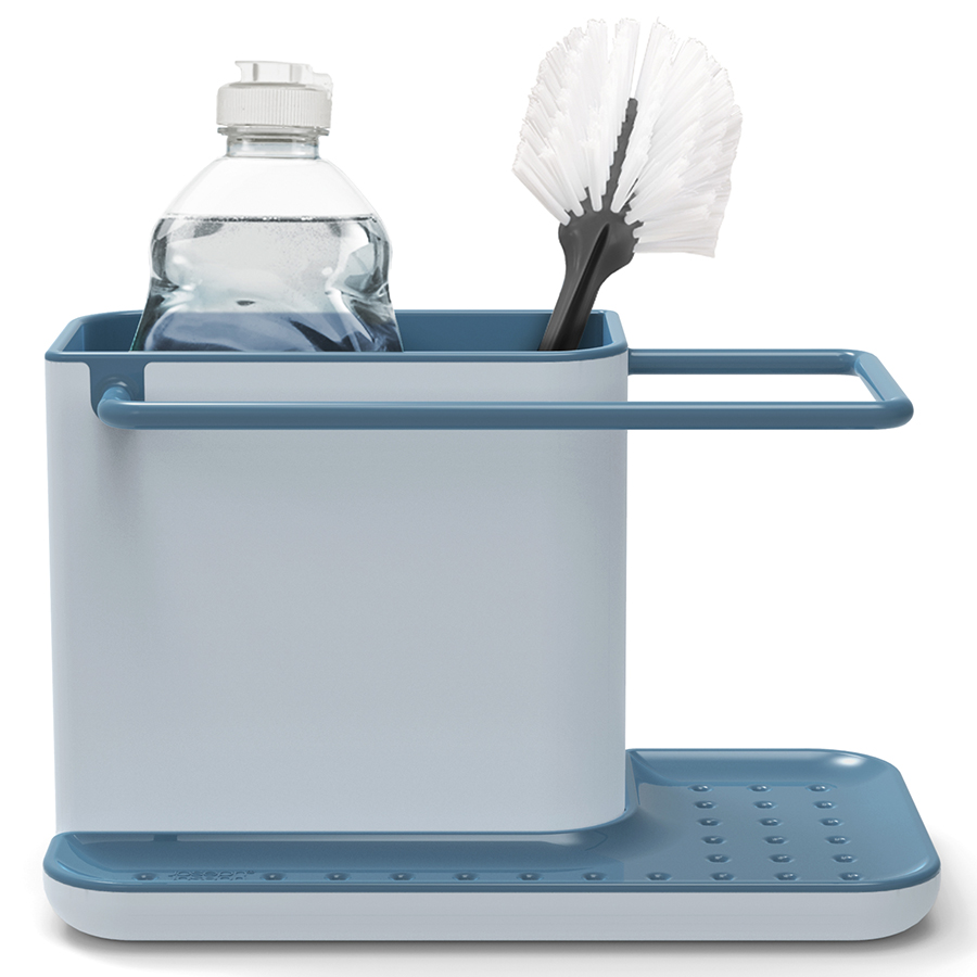 Вместительная основная емкость органайзера предназначена для хранения щеток и бутылок со средствами для мытья. На вешалке, расположенной вдоль ее внешнего края, удобно сушить небольшие тряпки. Широкий поддон с отверстиями предоставляет место для просушивания губок, а скрывающийся под ним резервуар аккуратно собирает стекающую воду. Органайзер легко собирается и разбирается для чистки.