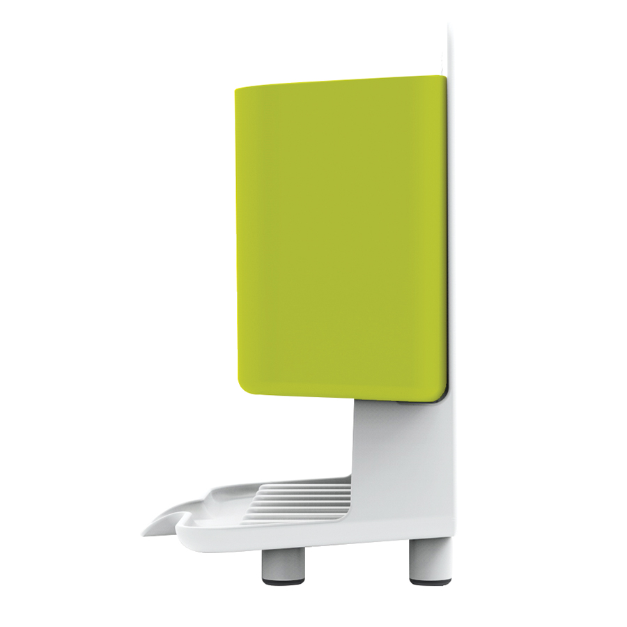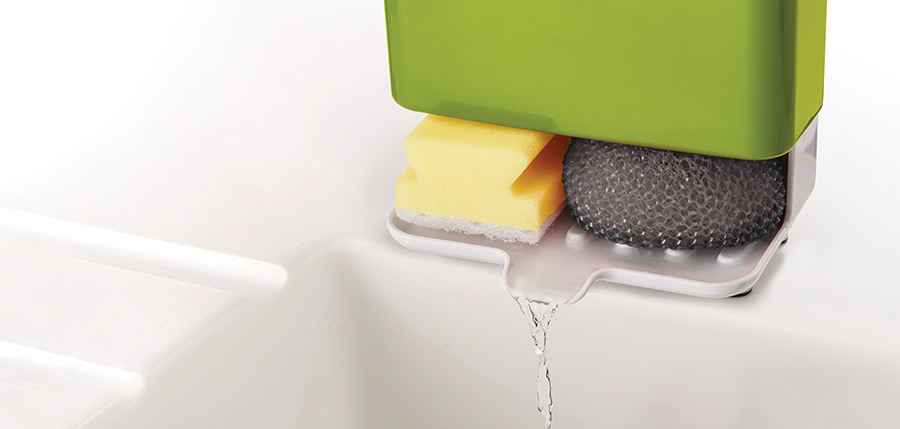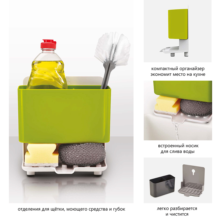 В органайзере есть отделения для щётки, моющего средства и губок. Его также можно разобрать для дополнительной очистки. Усеченная форма отлично подходит для узких поверхностей. Нескользящие ножки обеспечивают удобство использования. Есть встроенный носик для слива воды.