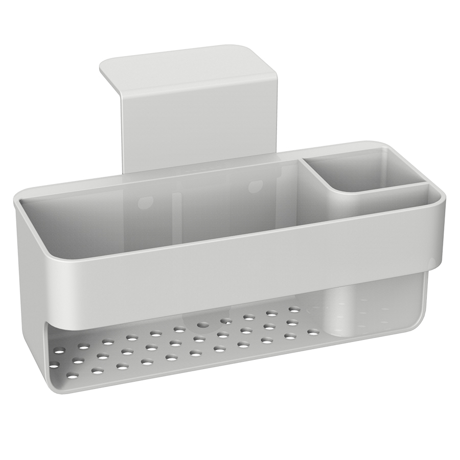 Органайзер Ronja позволит удобно разместить на раковине все необходимые аксессуары для очистки поверхностей и мытья посуды – губку, щетку, целлюлозную салфетку и пр. Специальная конструкция с отверстиями для оттока воды создает условия для быстрой сушки кухонной ветоши. Несмотря на небольшой вес, изделие из АБС-пластика отличается прочностью, устойчивостью к повреждениям и износу. Подвесная модель занимает минимум пространства.