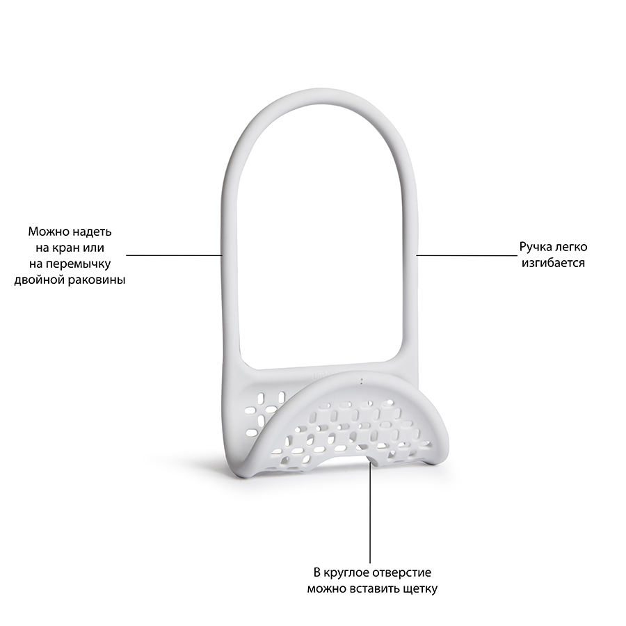 Ручка удобно гнется и позволяет вешать органайзер на водопроводный кран или боковую сторону раковины. Перфорация дает воздуху свободно циркулировать, поэтому губки и щетки будут сохнуть быстрее.