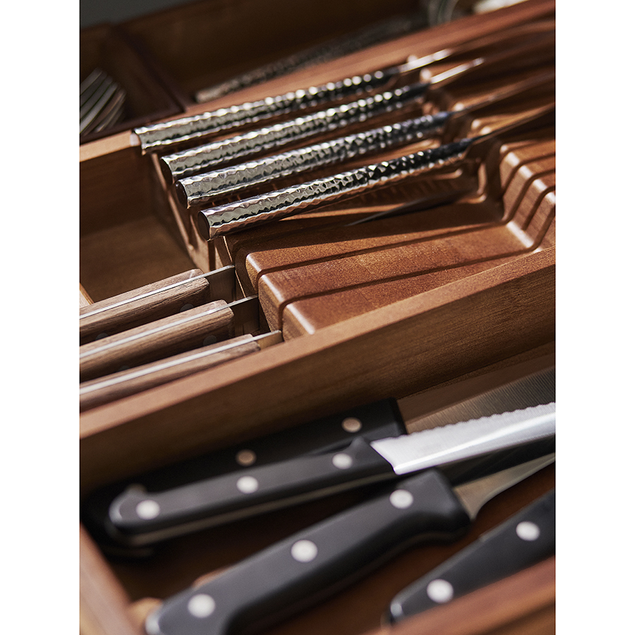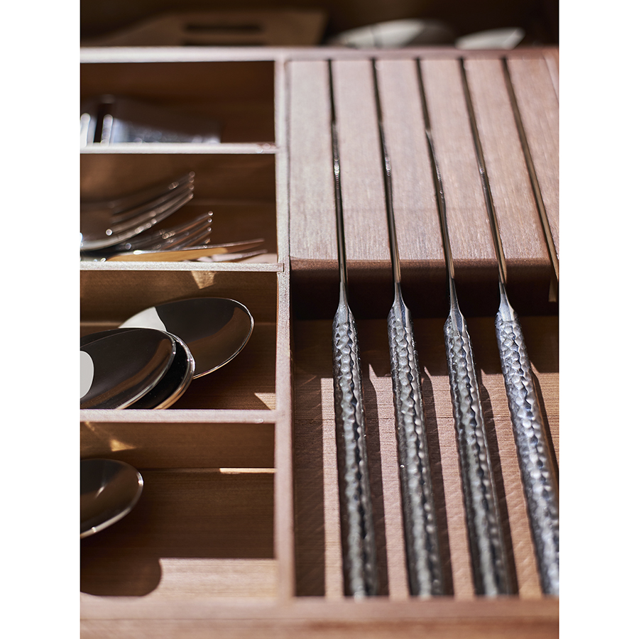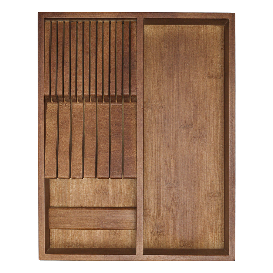 - Имеет несколько отделений и специальный держатель для ножей, что позволяет раздельно хранить все виды столовых приборов.