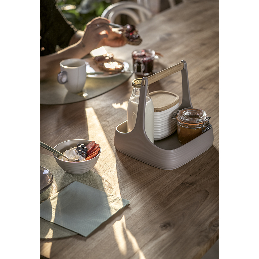 В качестве исходного сырья выступают пластиковые бутылки объемом 1,5 л. Дизайн изделия напоминает керамику. Реалистичности внешнему виду придают тщательно подобранные пастельные цвета и намеренно неровные круговые рисунки, создающие эффект ручной работы. Органайзер отлично гармонирует с другими предметами коллекции Tierra.