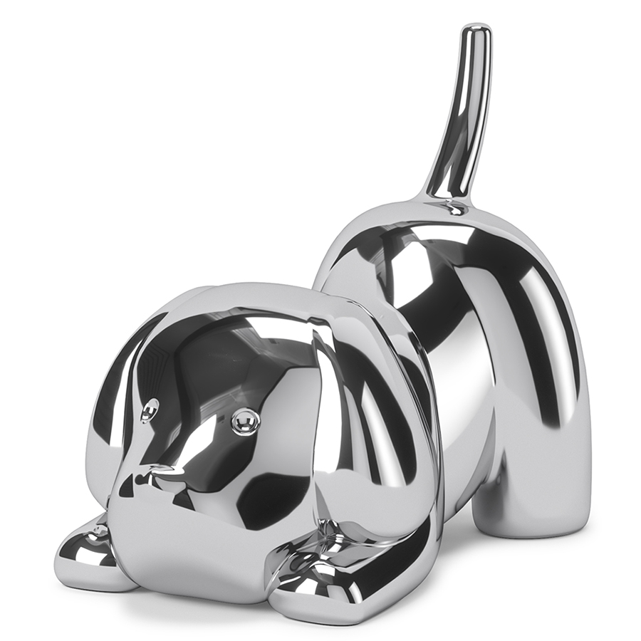 Хвост щенка является импровизированной вешалкой для колец и перстней, которая вмещает более 8 украшений. Аксессуар изготовлен из цинкового металла с блестящим хромированным покрытием. Основание подставки имеет войлочную подкладку для защиты поверхности от царапин.