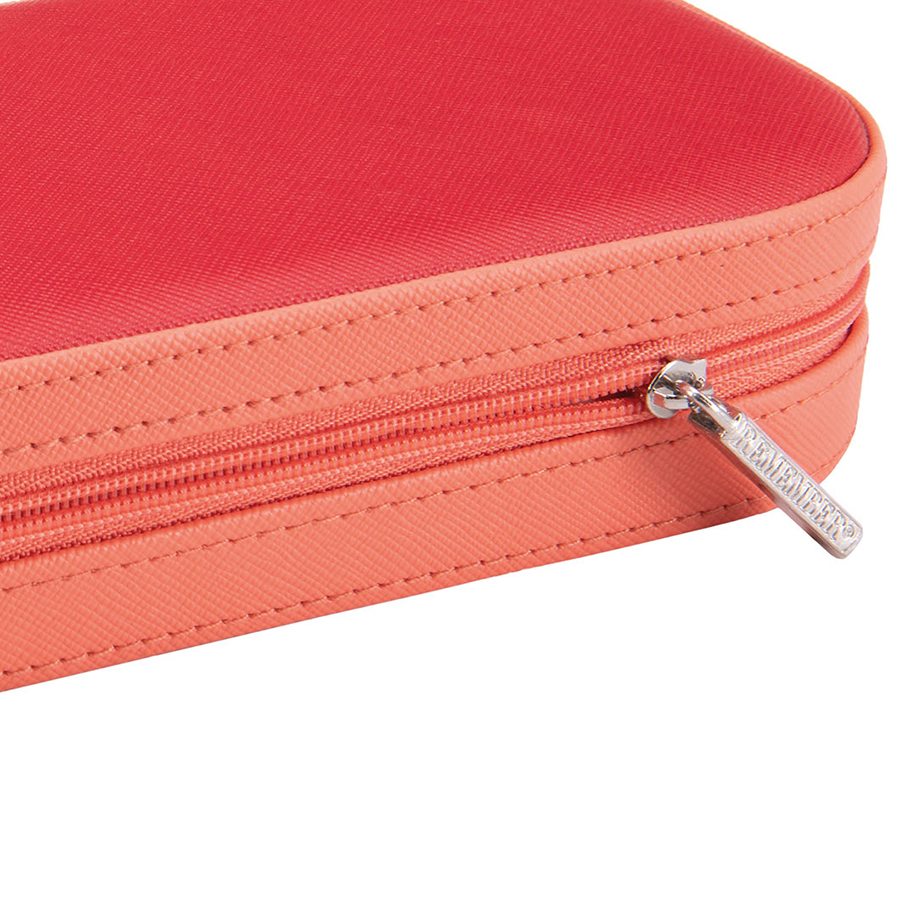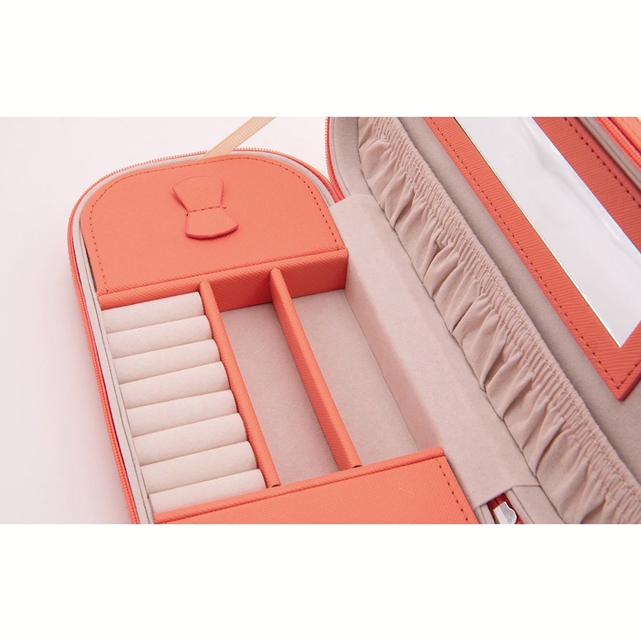 Шкатулка включает несколько секций для хранения украшений, кармашки для колец и зеркало. Застегивается на надежную молнию.