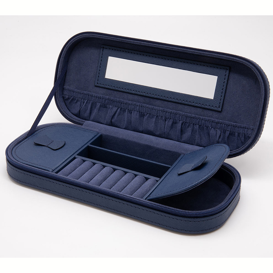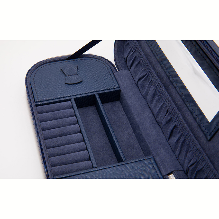 Шкатулка включает несколько секций для хранения украшений, кармашки для колец и зеркало. Застегивается на надежную молнию.