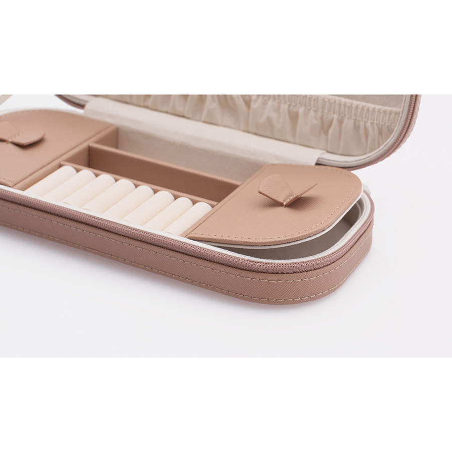 Шкатулка включает несколько секций для хранения украшений, кармашки для колец и зеркало. Застегивается на надежную молнию.
