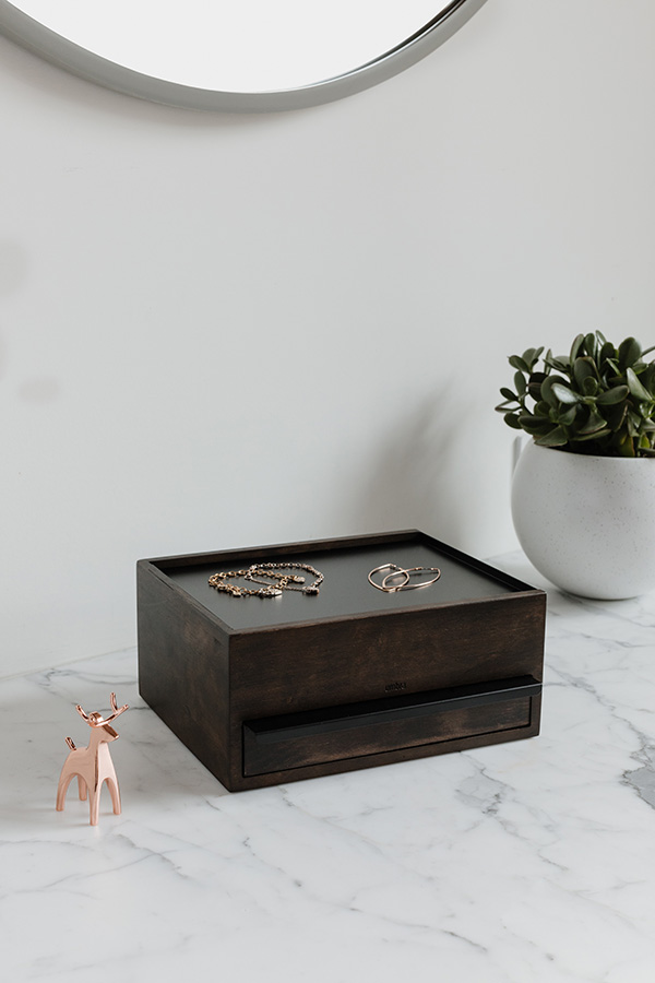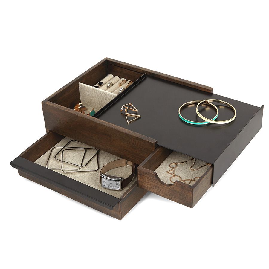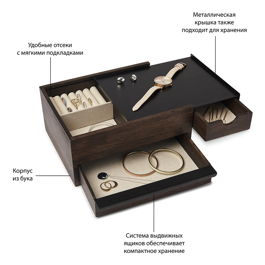 Верхнее отделение оснащено кармашками для колец или запонок и небольшими ящичками для прочих мелочей. Нижняя часть предназначена для хранения более крупных аксессуаров: часов или браслетов.